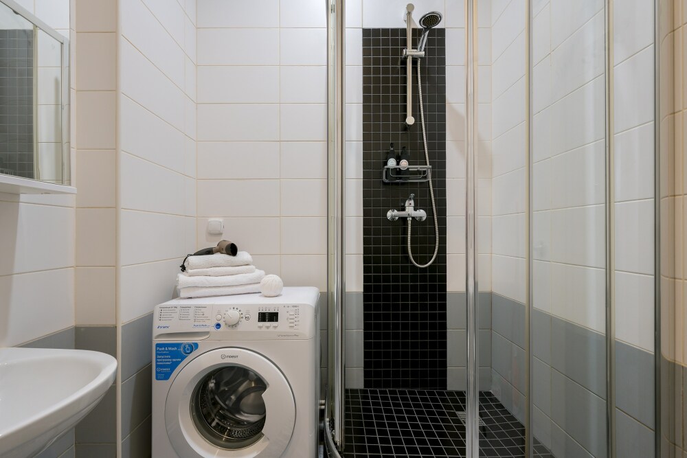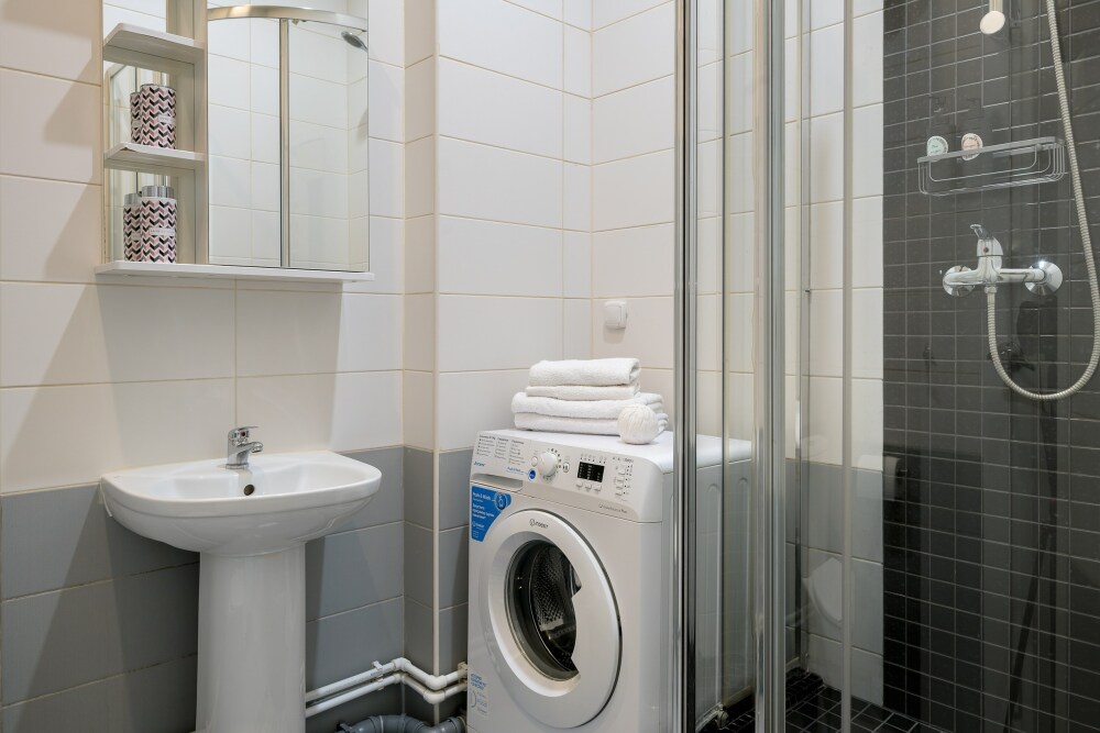 Вся необходимая мебель и техника: удобная двуспальная кровать, раскладной двуспальный диван; ЖК-телевизор; кухонный гарнитур, электрический чайник, микроволновка, посуда, утюг, фен; собственный санузел (ванна, туалет, стиральная машинка).