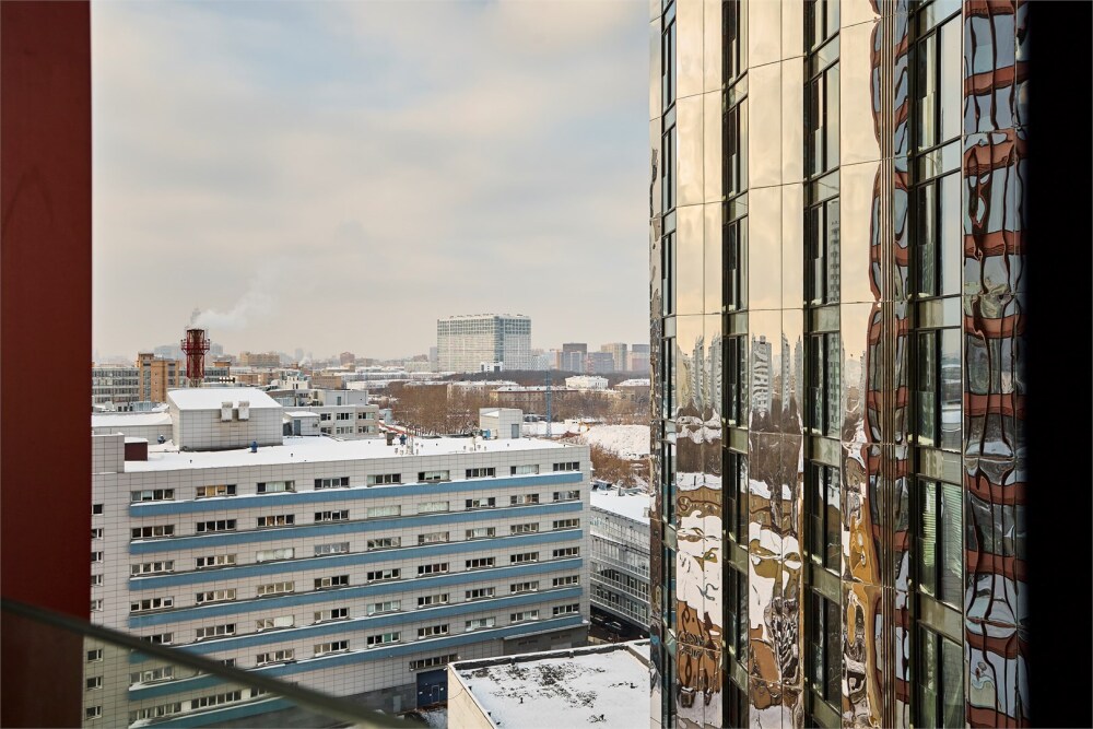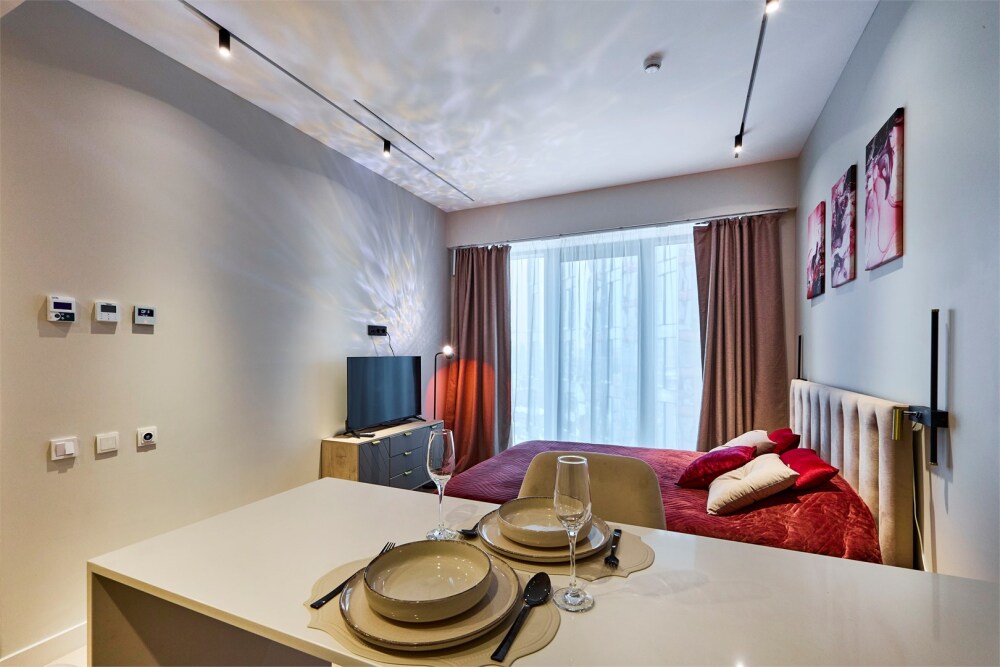 Современная студия в жилом комплексе бизнес-класса «Симфония», расположенная на 12 этаже с панорамным окном, которое наполняет квартиру естественным светом и открывает впечатляющие виды.