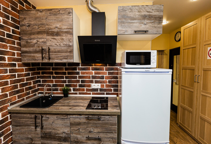 - Кухня с холодильником, плитой, микроволновкой, чайником и посудой.