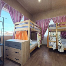 Койко-место в общем 6-ти местном номере. Три двухярусные кровати, мебель, вай -фай, общая кухня в доме, общие два санузла. Парковка своя, мангальная зона, беседка. Вид из окна во двор.