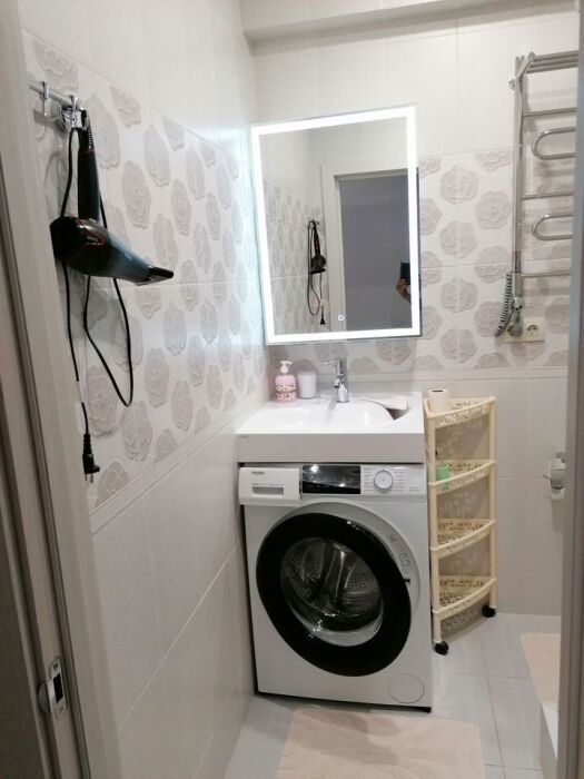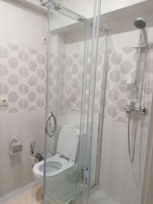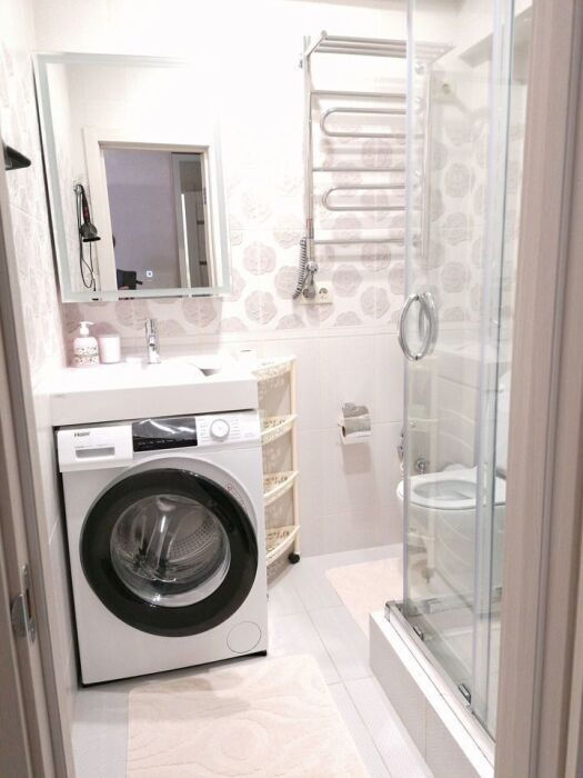 - Санузел оснащен раковиной с зеркалом, душевой кабиной, стиральной машиной и унитазом. Средства для личной гигиены.