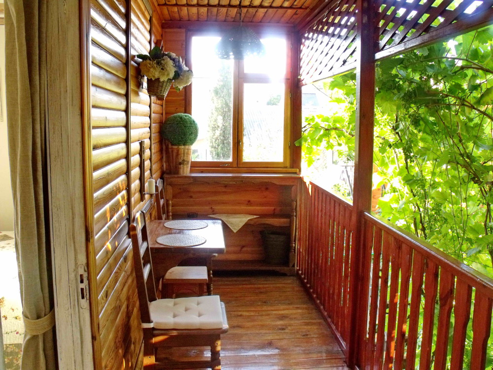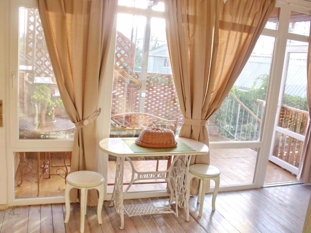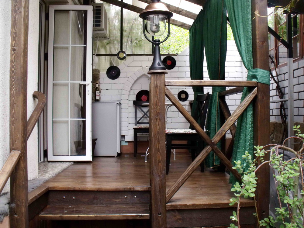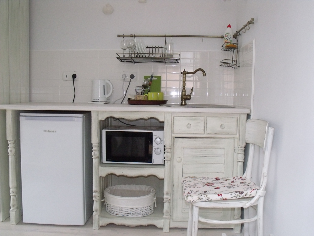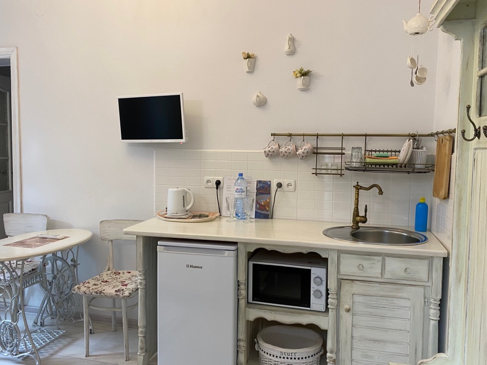 Уютный, комфортный номер с отдельным входом,  террасой или балконом; оформлен винтажными, авторскими работами, мини-кухня (мойка, электрический чайник, посуда, холодильник, микроволновая печь).
