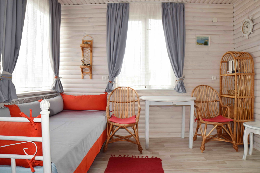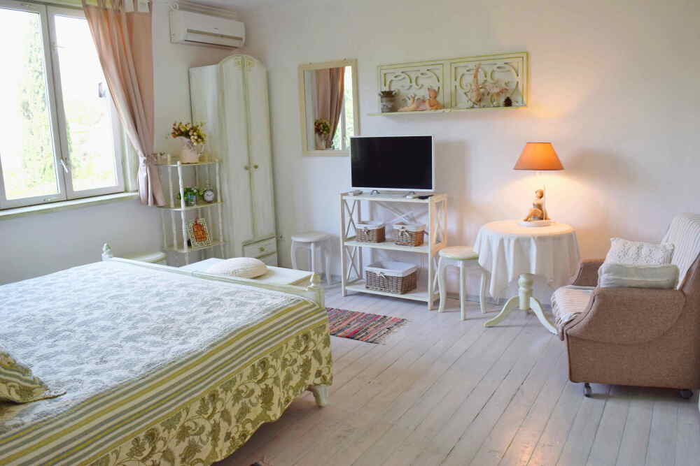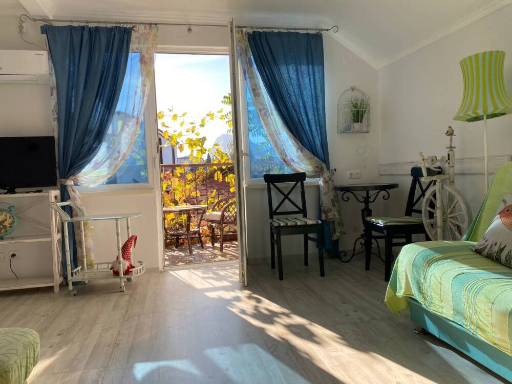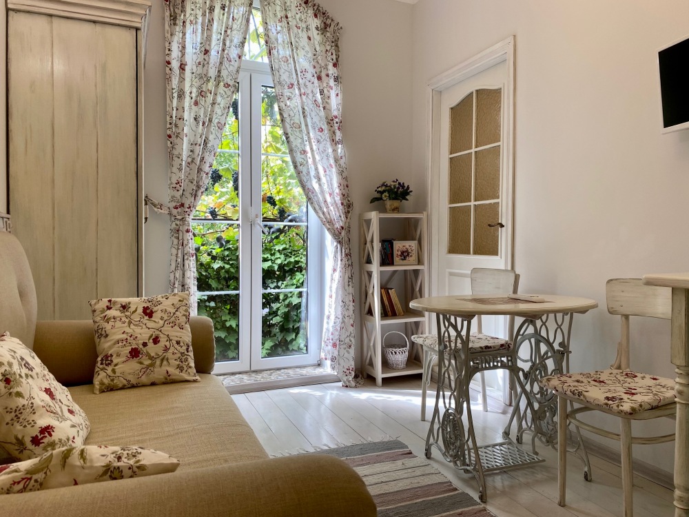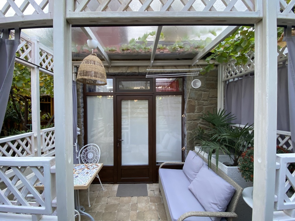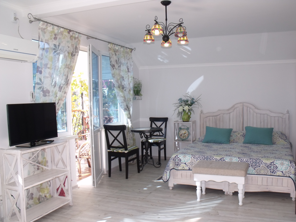 Уютный, стильный номер, имеет все необходимое для комфортного проживания: большая двуспальная кровать с ортопедическим матрасом, шкаф, кофейный столик, посуда,холодильник . В прохладное время года предусмотрен подогрев пола. Номер имеет собственную зону отдыха возле номера ( свой столик возле номера в виноградной беседке).