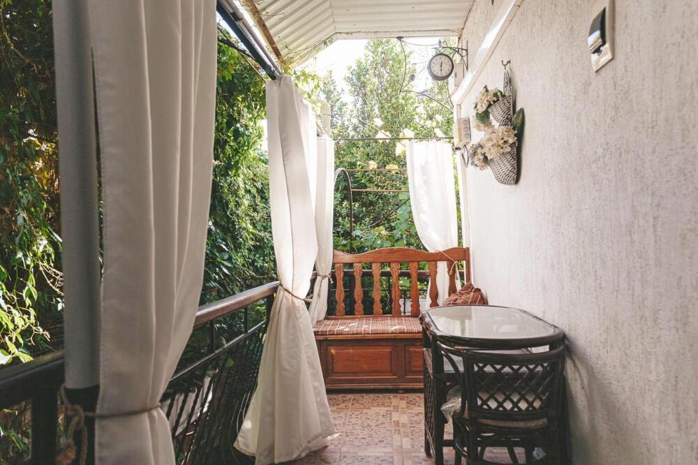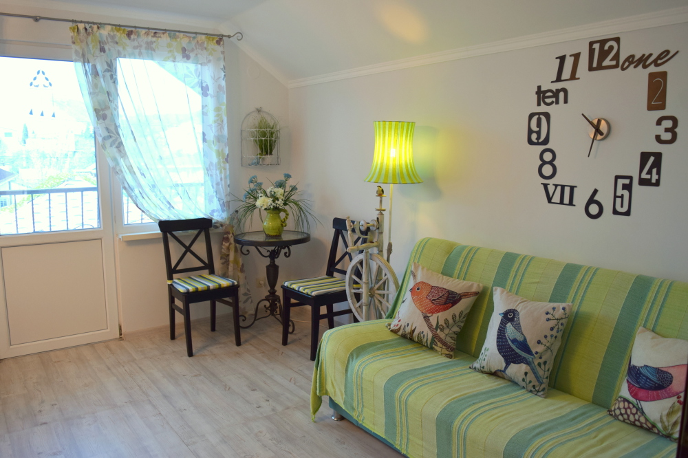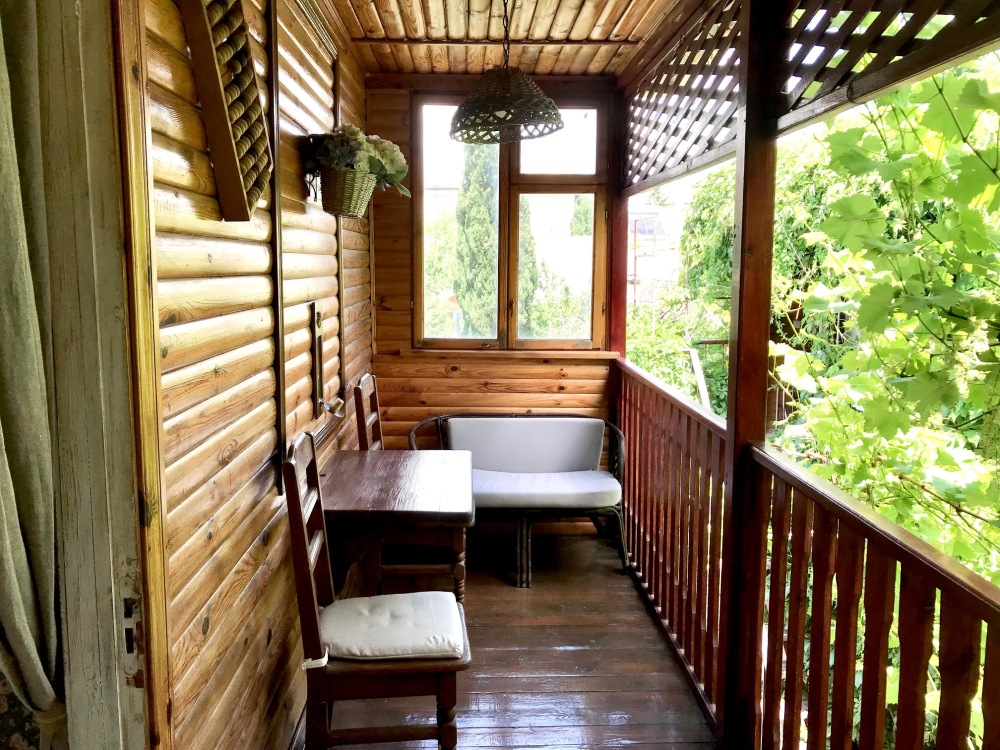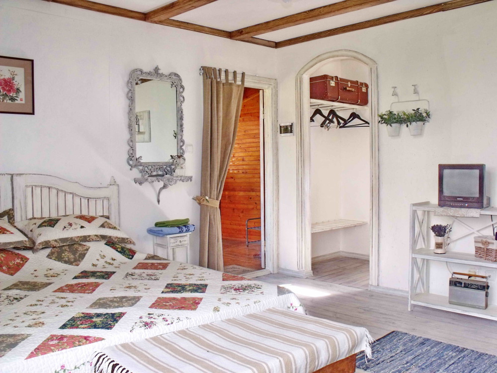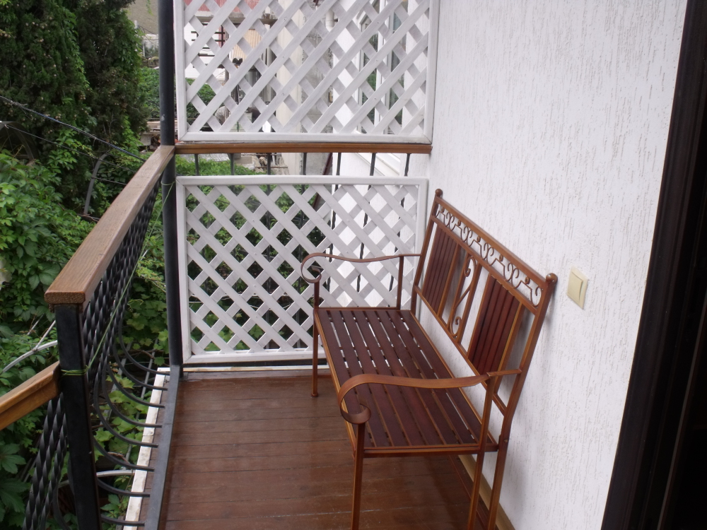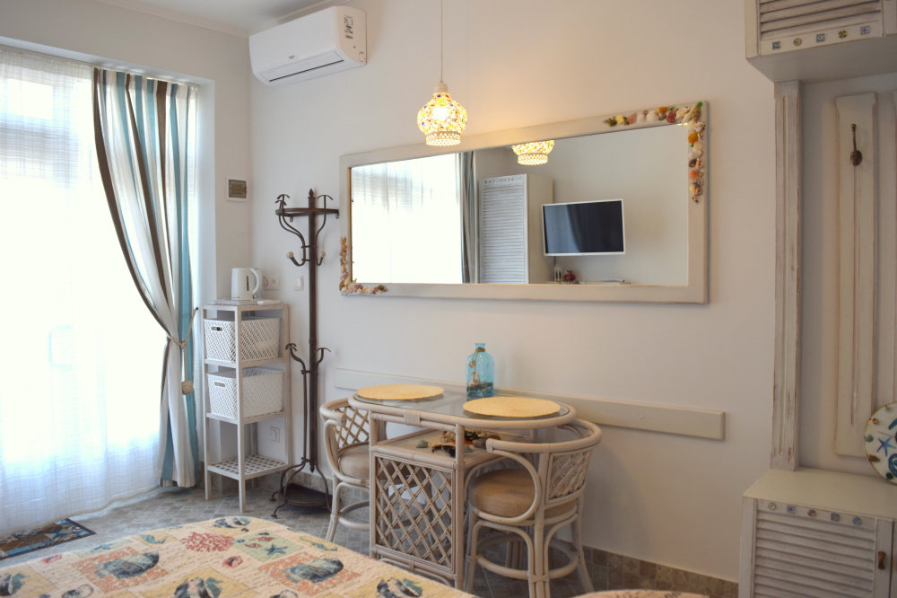 Уютный, стильный номер, имеет все необходимое для комфортного проживания: большая двуспальная кровать с ортопедическим матрасом, шкаф, кофейный столик, посуда,холодильник . В прохладное время года предусмотрен подогрев пола. Номер имеет собственную зону отдыха возле номера ( свой столик возле номера в виноградной беседке).