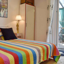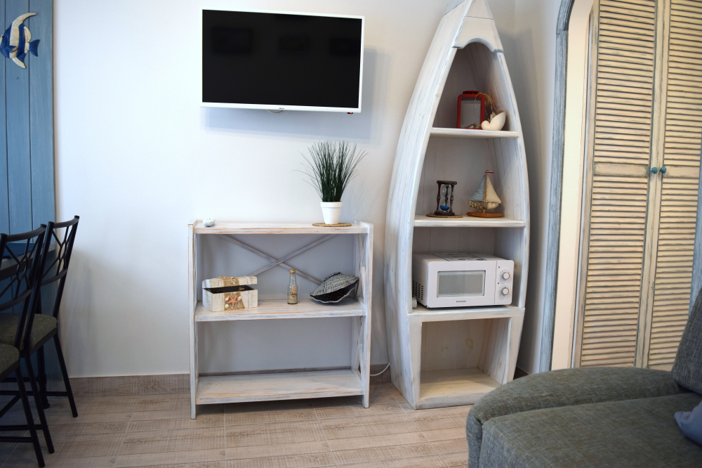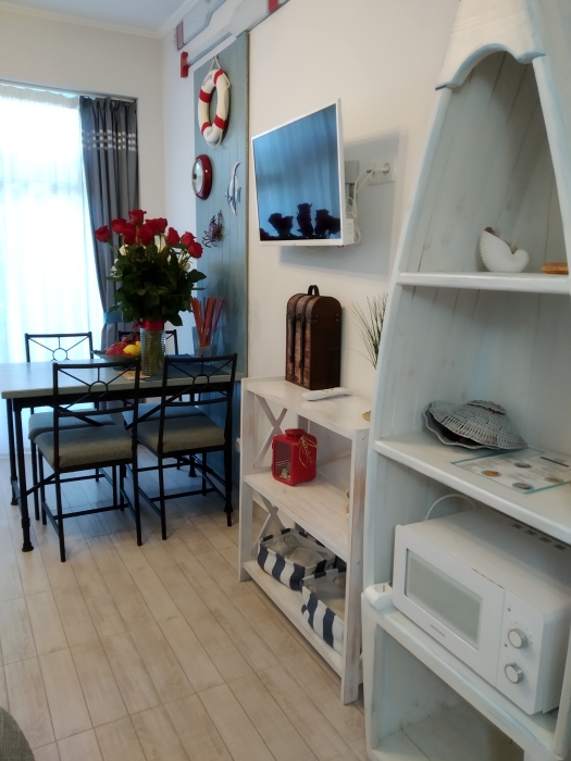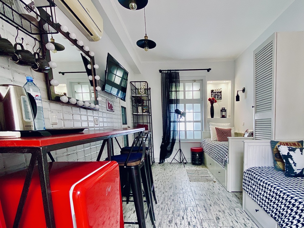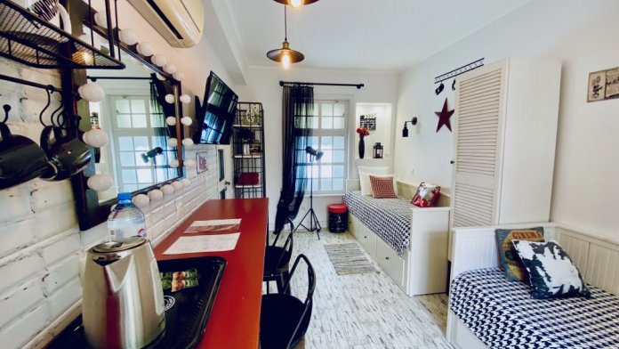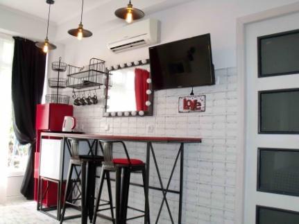 В номере: две отдельных кровати (0.8х2м) (одна из кроватей при необходимости раскладывается в двуспальную размером 1.6х2 м), шкаф, барный стол, стулья, зеркало, LCD телевизор, холодильник, кондиционер, электрический чайник, посуда