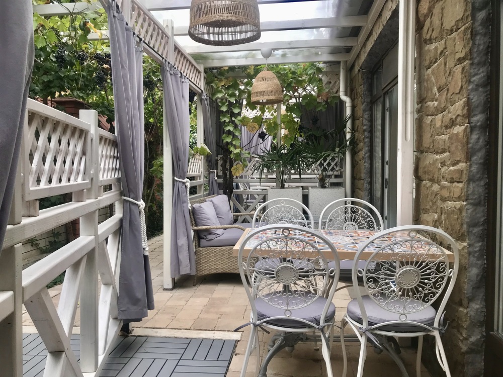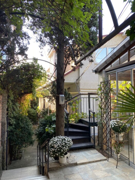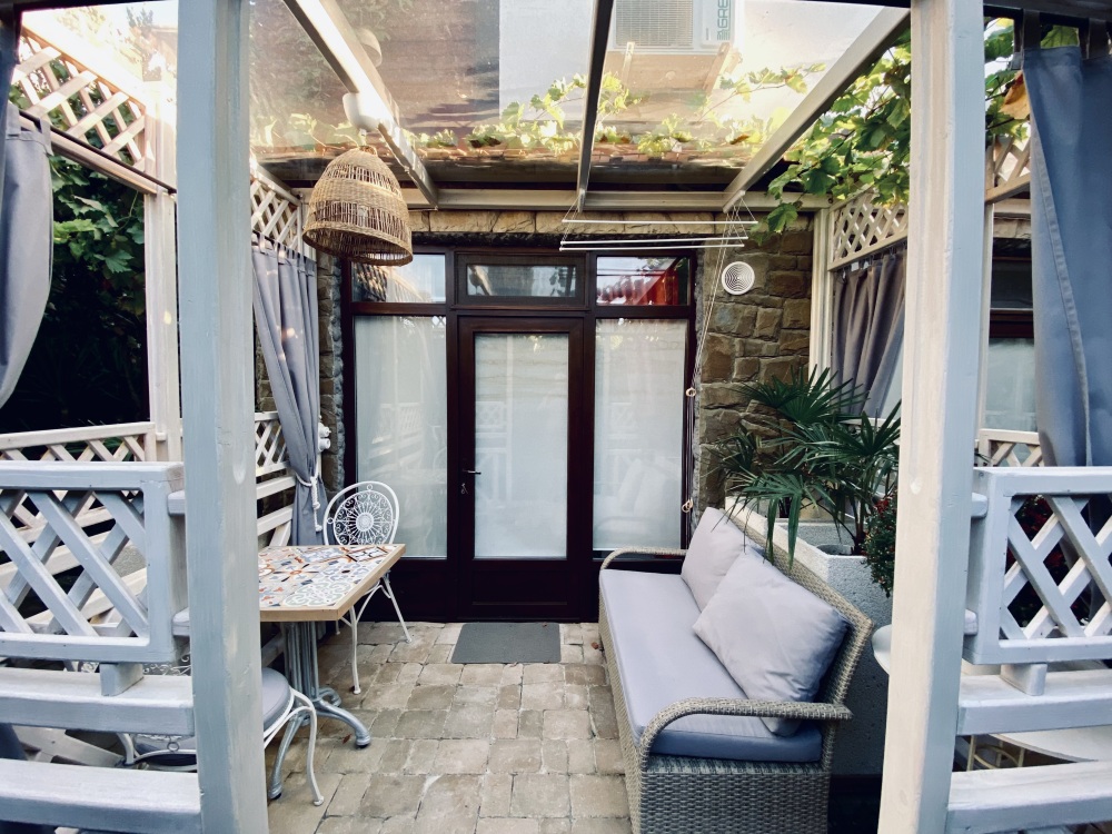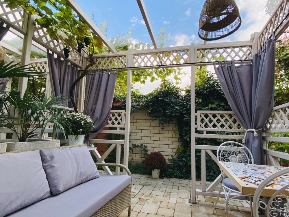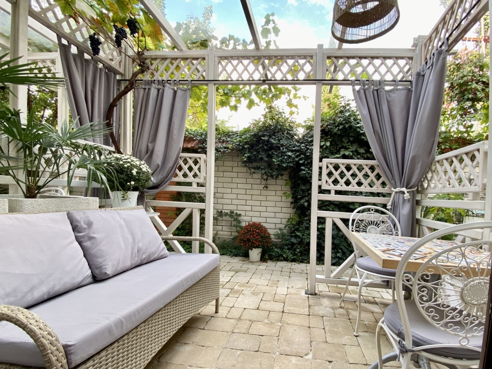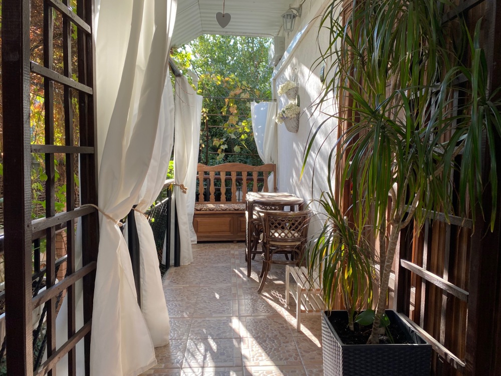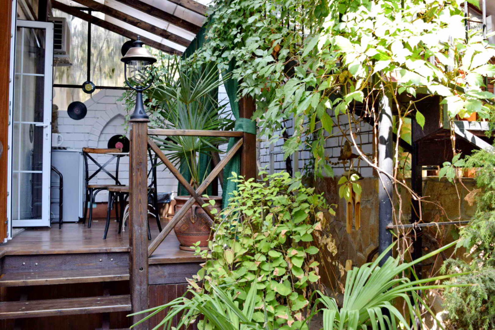 Собственная терраса - место для уединенного отдыха на свежем воздухе в зелёном уголке двора со столиком и пальмой в горшке, отдельный вход.
