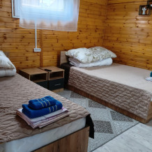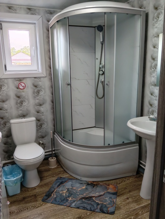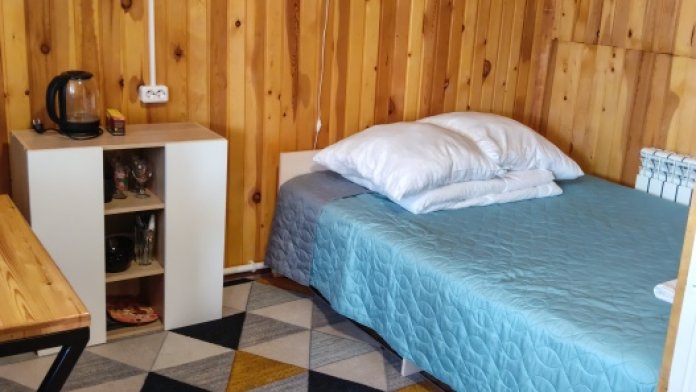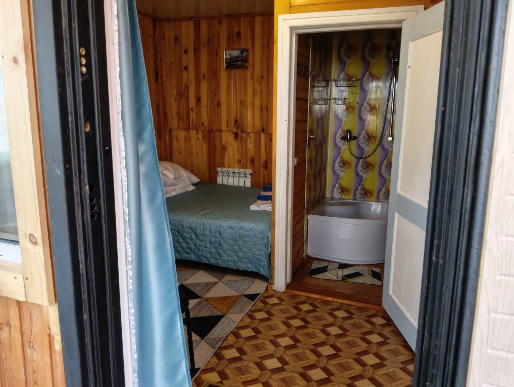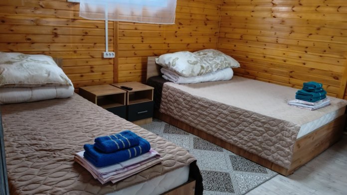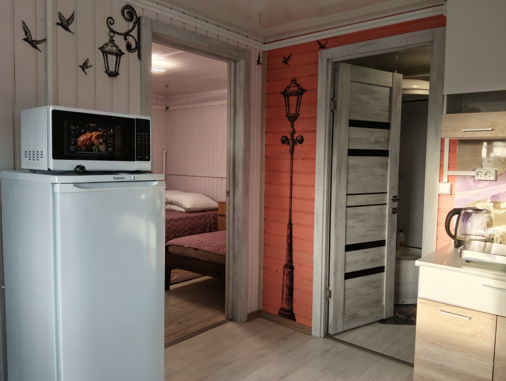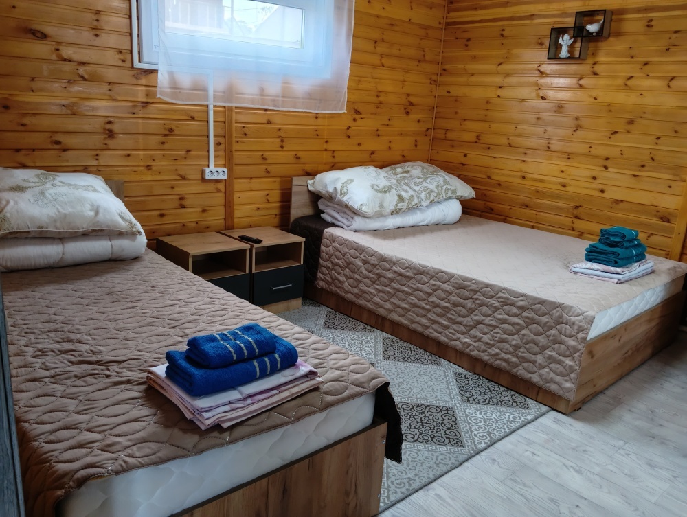 В домике есть своя кухня со всей необходимой посудой и бытовой техникой для комфортного проживания, wi-fi, также в домике есть две раздельные комнаты в каждой комнате по 2 односпальные кровати, для хранения белья есть небольшие комоды, в с. узле имеется душевая кабина, унитаз, раковина для умывания, фен, туалетные принадлежности (мыло, шампунь, зубные щетки, тапочки).