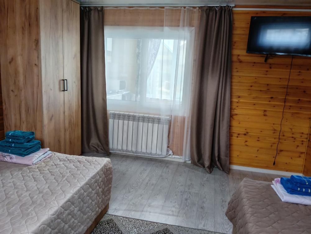 В номере расположена просторная комната с двумя кроватями 140/200 и 90/200, шкаф для хранения белья, прикроватные тумбы, постельное бельё, полотенца, телевизор,wi-fi. На кухне имеется вся необходимая посуда для комфортного проживания, электрическая плита, чайник, холодильник, микроволновая печь, в с/у есть душевая кабина, раковина для умывания, унитаз, туалетные принадлежности (зубные щетки, шампунь, мыло, тапочки).