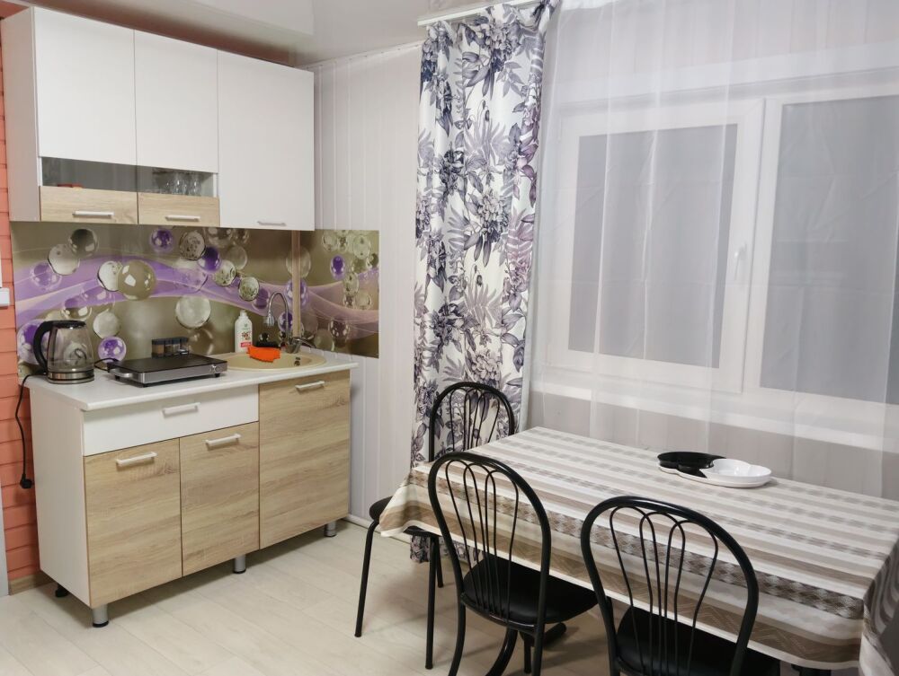 Кухня оборудована всей необходимой бытовой техникой, в комнате расположены три кровати- двухспальная и две односпальные, комоды для хранения вещей, смарттv, постельное бельё и полотенца, в ванной комнате душевая кабина, раковина, унитаз, разовые шампунь, мыло, зубные щётки и тапочки.