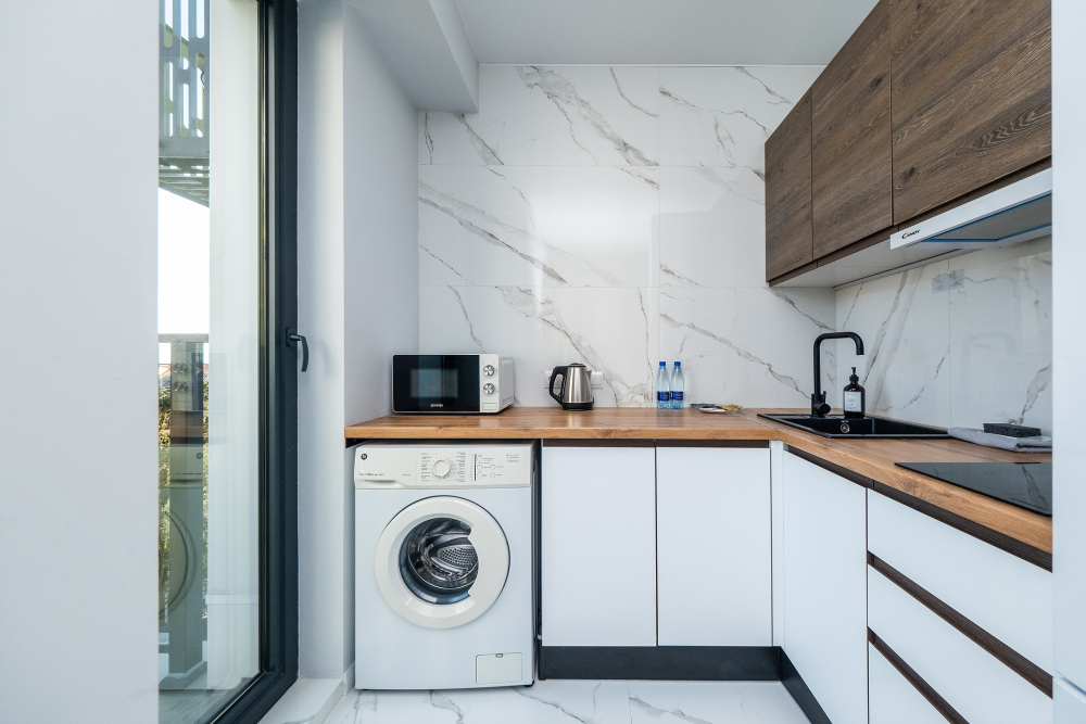 Полностью оборудованная кухня: Холодильник, плита, микроволновая печь и стиральная машина – всё для вашего удобства.