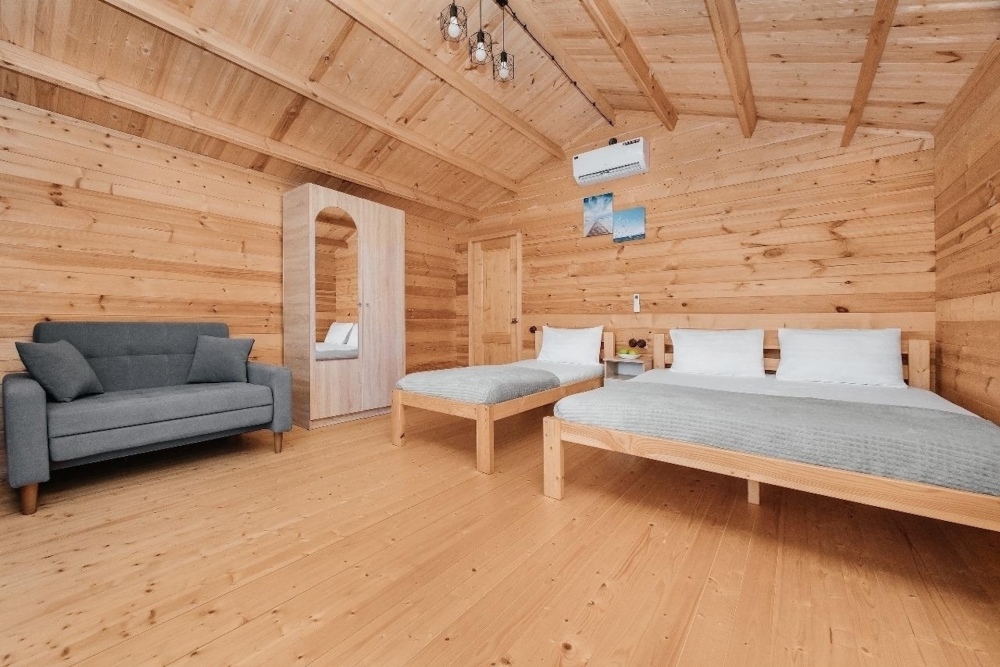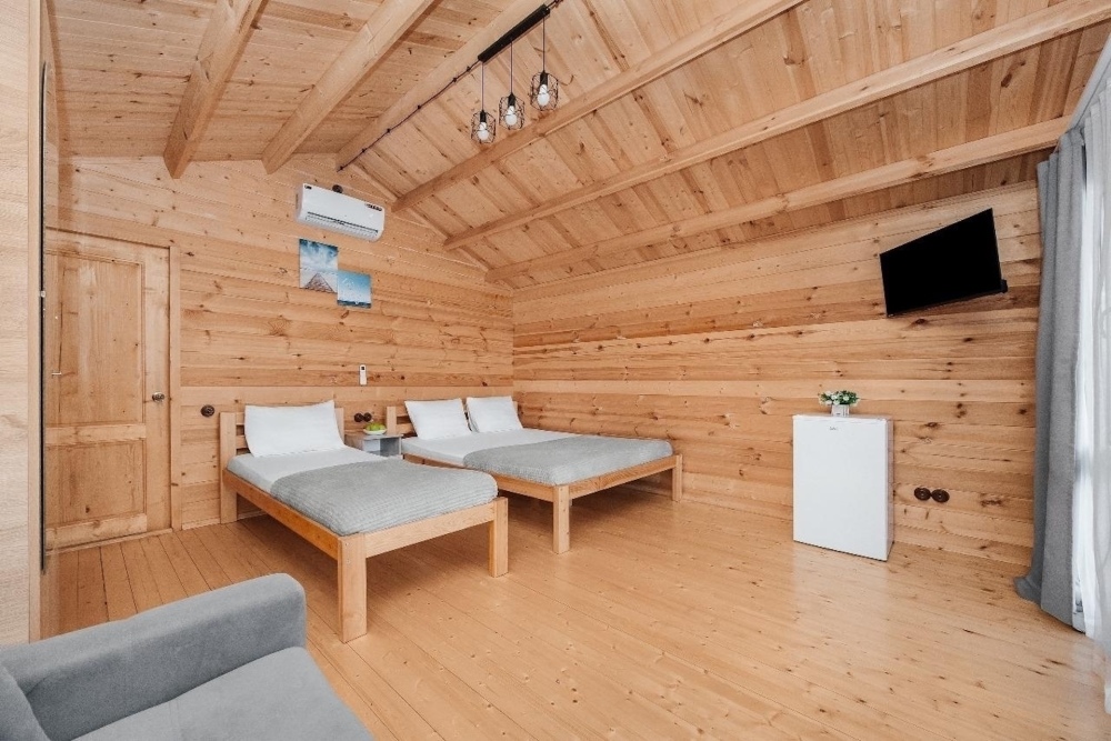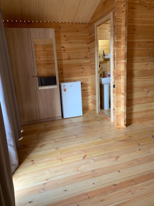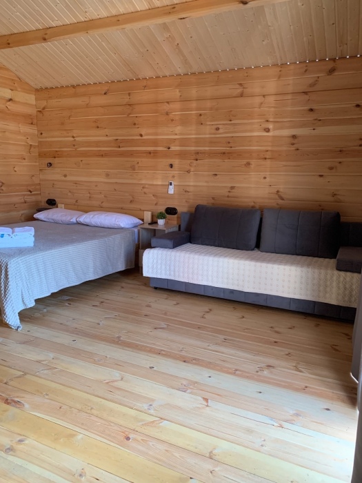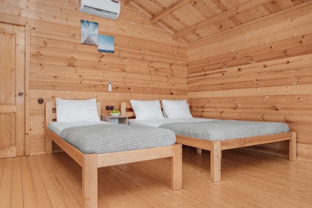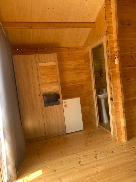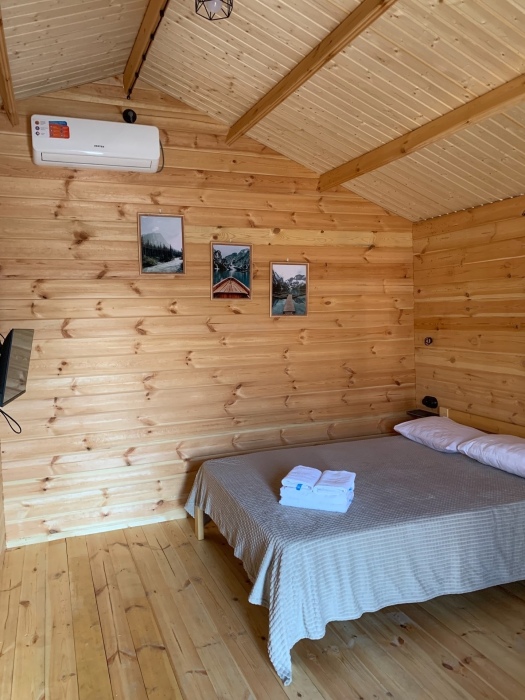 В каждом домике есть фен, чайник, холодильник, Смарт- ТВ, WI-FI, также имеется кондиционер и просторная ванная комната. У каждого домика есть своя веранда на которой расположены стол и стулья для отдыха на свежем воздухе.