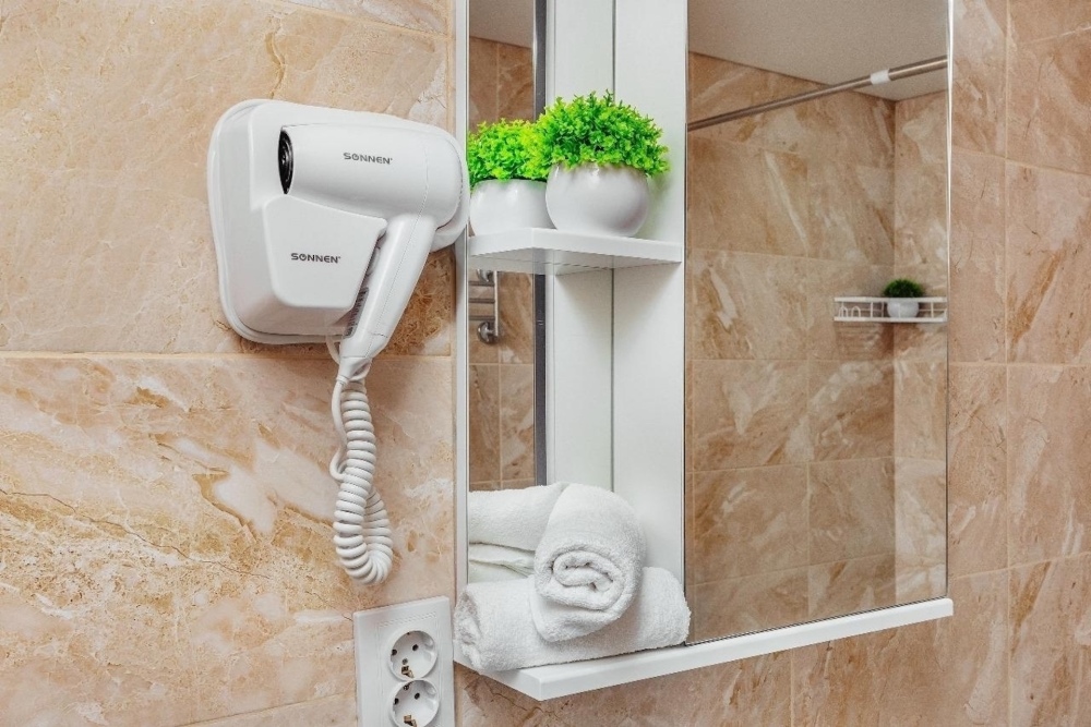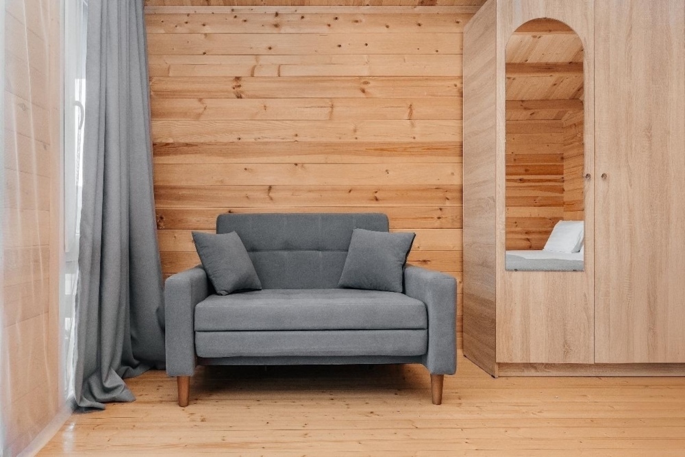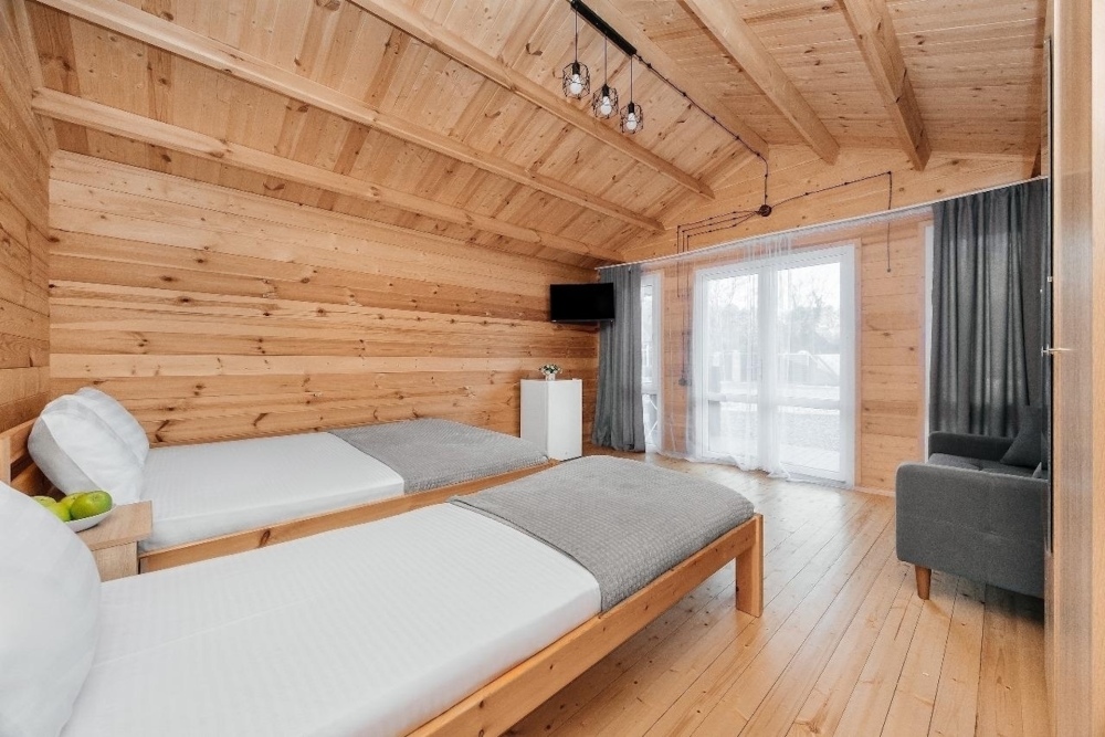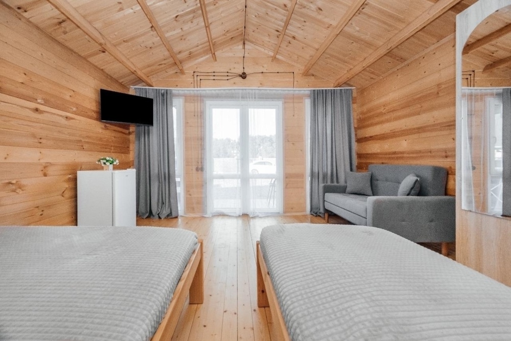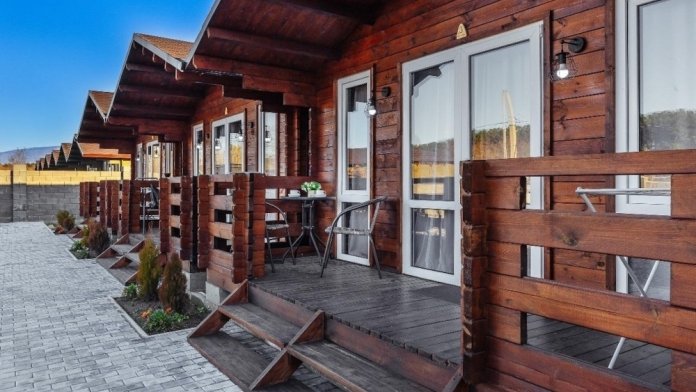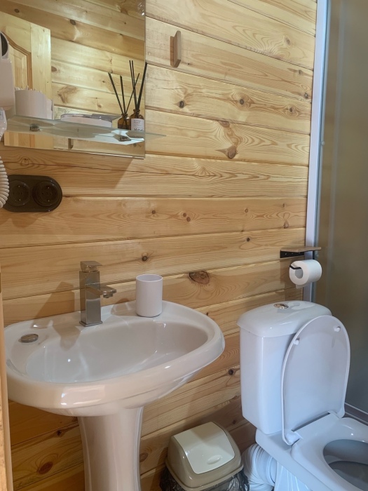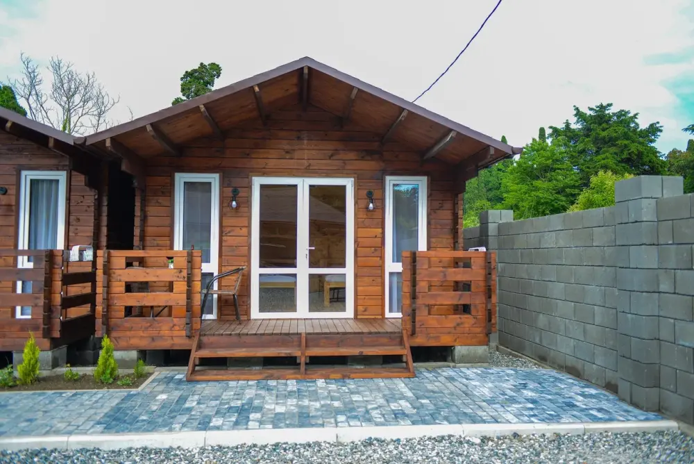 В каждом домике есть фен, чайник, холодильник, Смарт- ТВ, WI-FI, также имеется кондиционер и просторная ванная комната. У каждого домика есть своя веранда на которой расположены стол и стулья для отдыха на свежем воздухе.