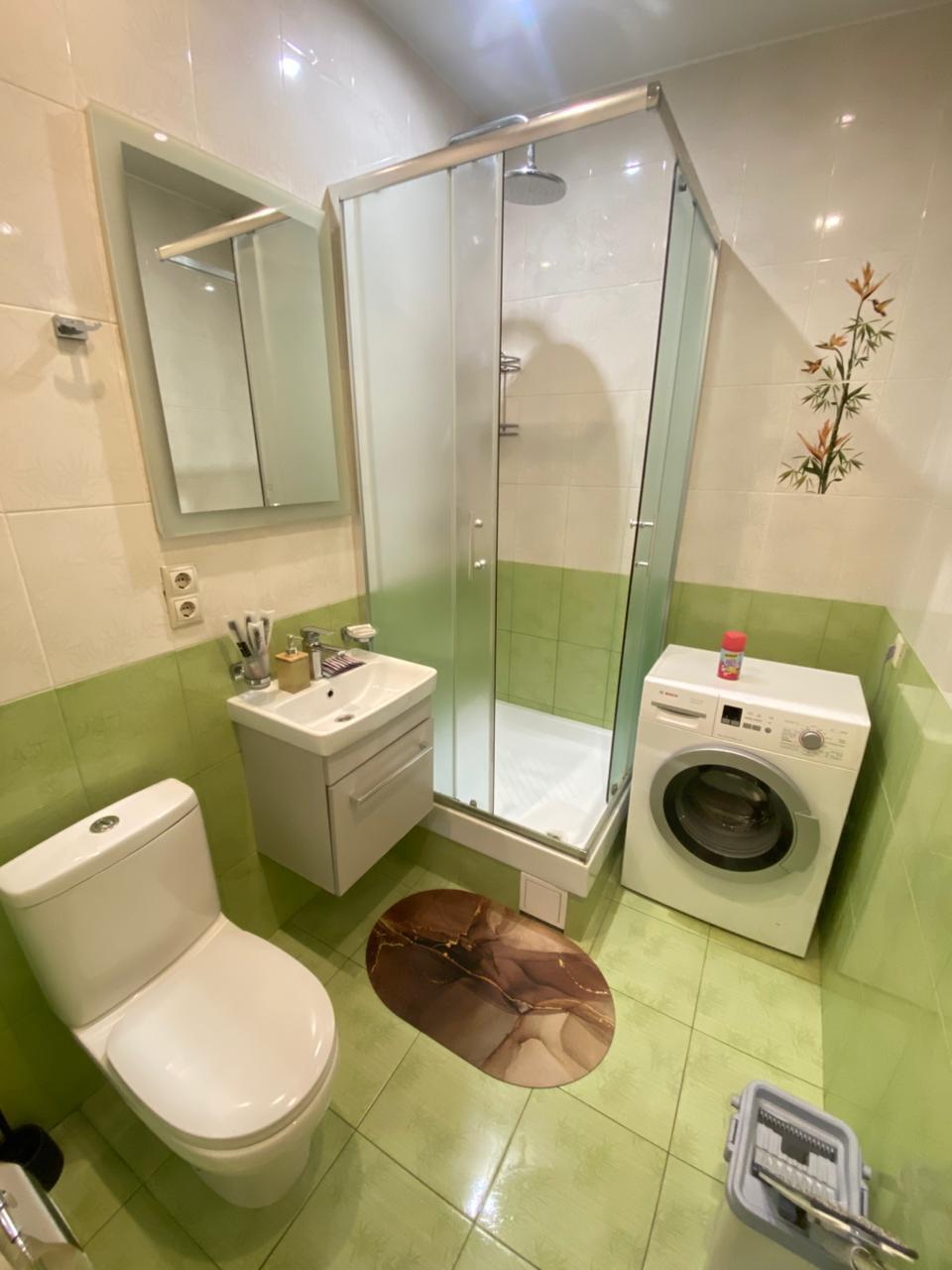 - Душевая кабина, стиральная машина, фен, одноразовые гель для душа, шампунь, мыло, зубные щётки, тапочки.