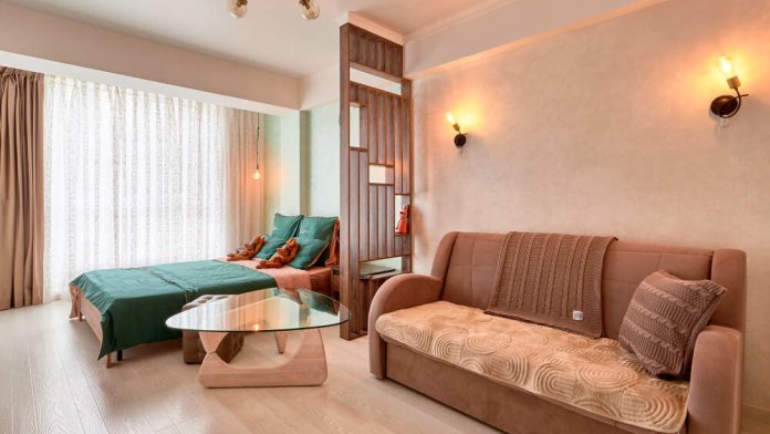 Квартира рассчитана на 4 человека (детская кровать и доп. место организуем): в комнате двуспальная кровать, раздвижной диван в комнате и кухонной зоне.