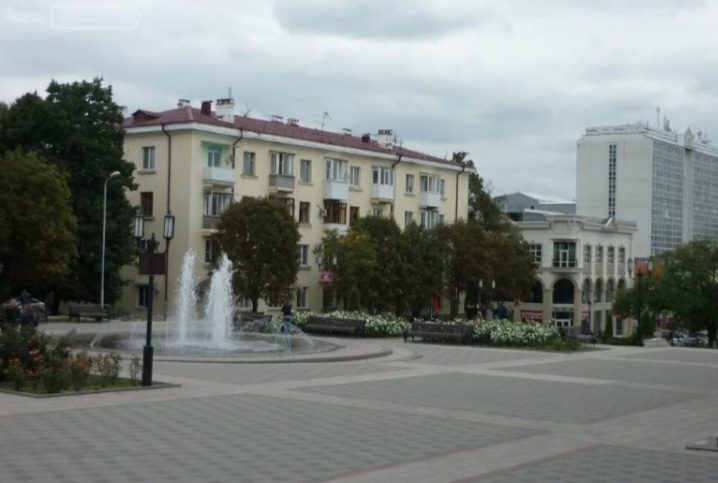 С балкона открывается вид на сквер городской библиотеки и администрации, а также небольшой фонтан.