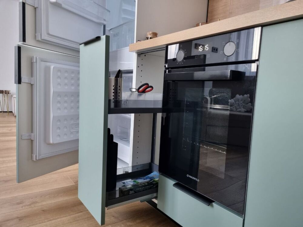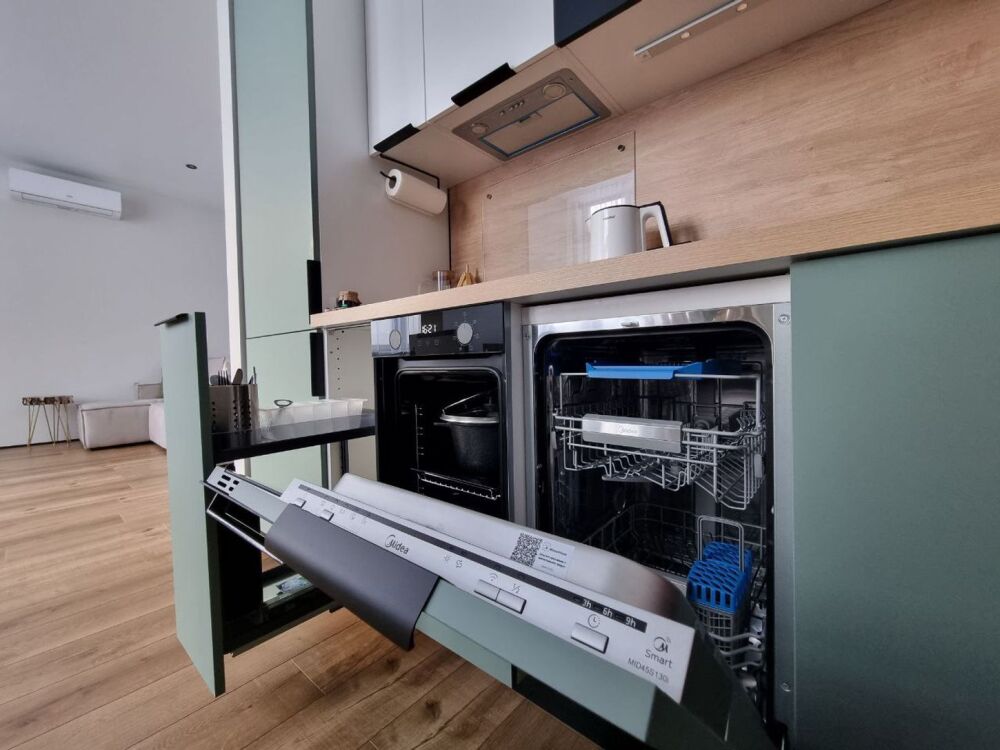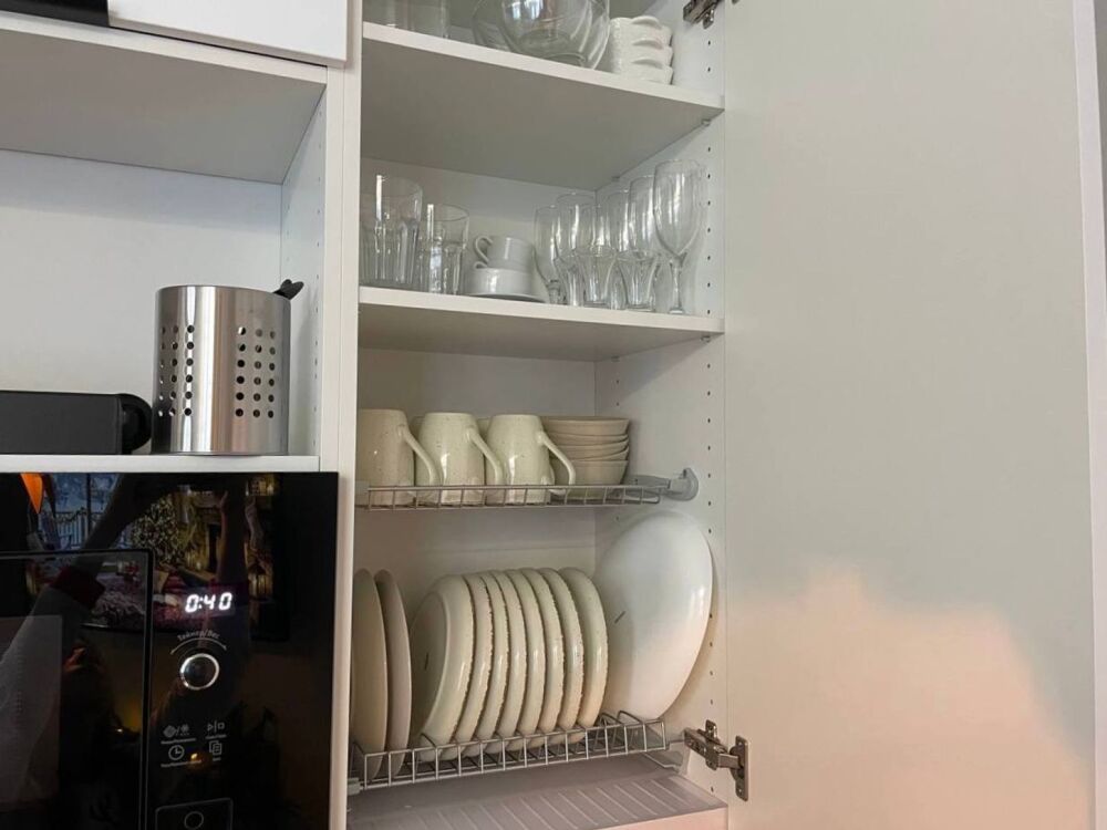Полноценная кухня: холодильник, варочная панель, духовой шкаф, микроволновка, чайник, посудомоечная машина и вся необходимая посуда (в частности, кастрюли, сковороды, столовые приборы на 6 персон).