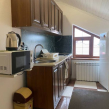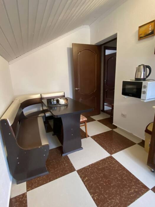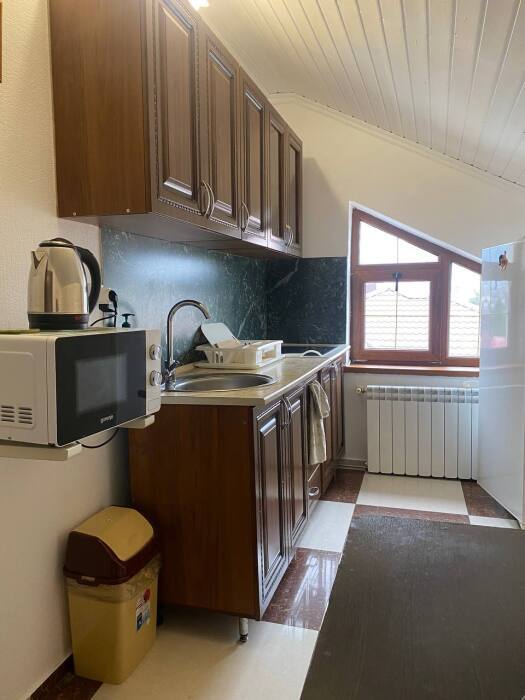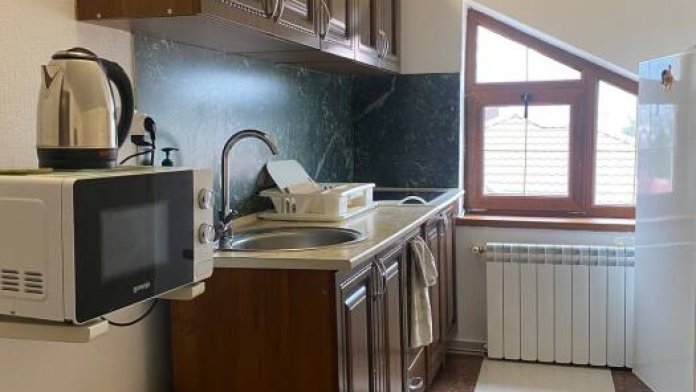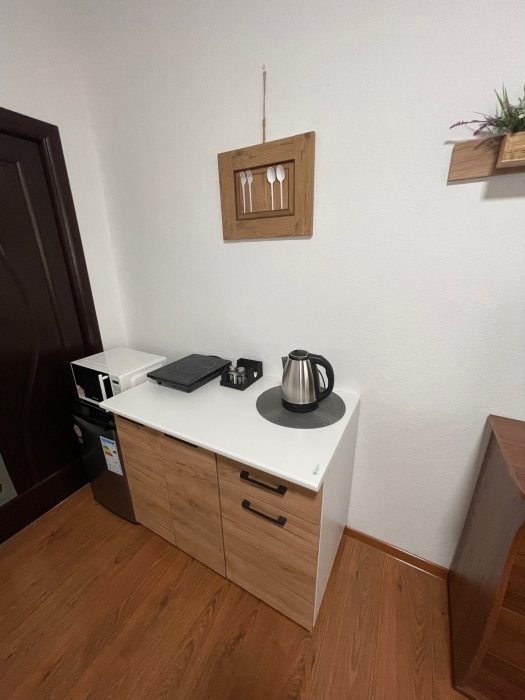 Номер люкс со своей мини кухней, кухня оснащена: свч, электрочайник, индукционная плита, вся необходимая посуда