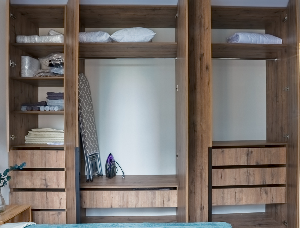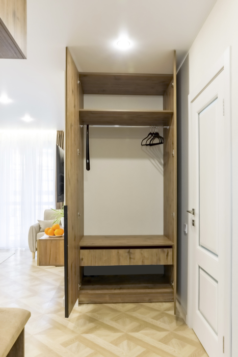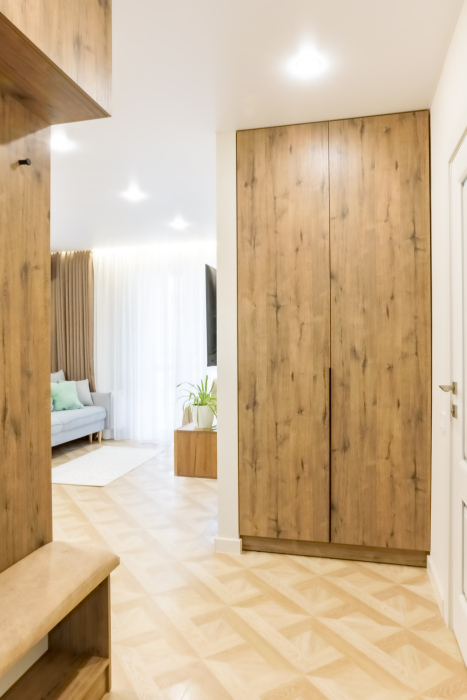 - Встроенная корпусная мебель с большим количеством мест для хранения.