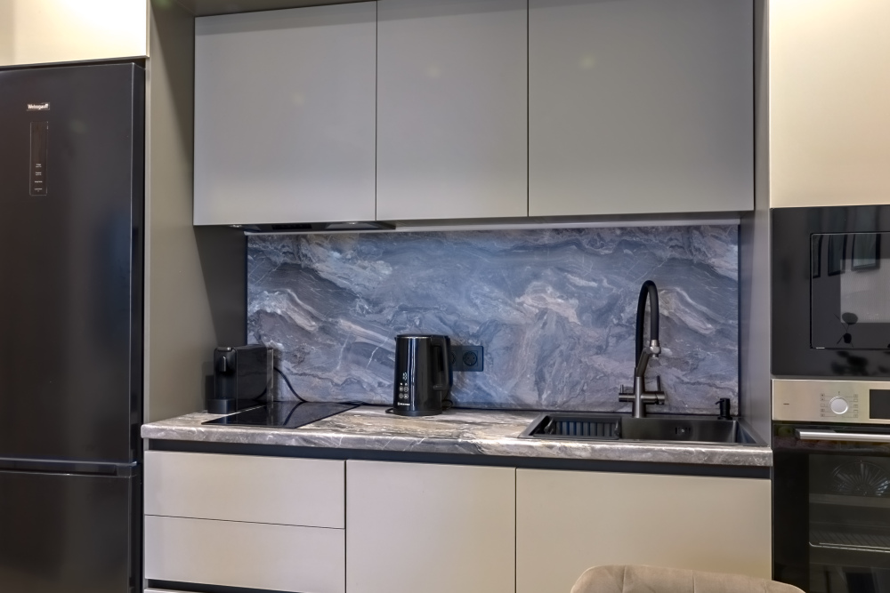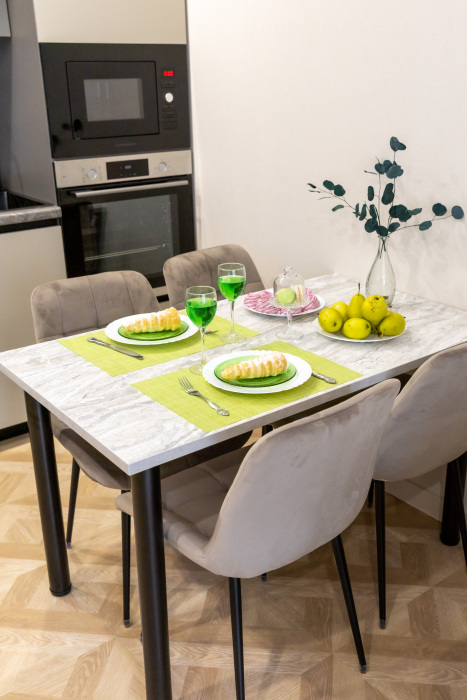- Полностью оборудованная встроенная кухня: индукционная плита, духовка, микроволновка, посудомойка, капсульная кофемашина, чайник, фильтр воды.