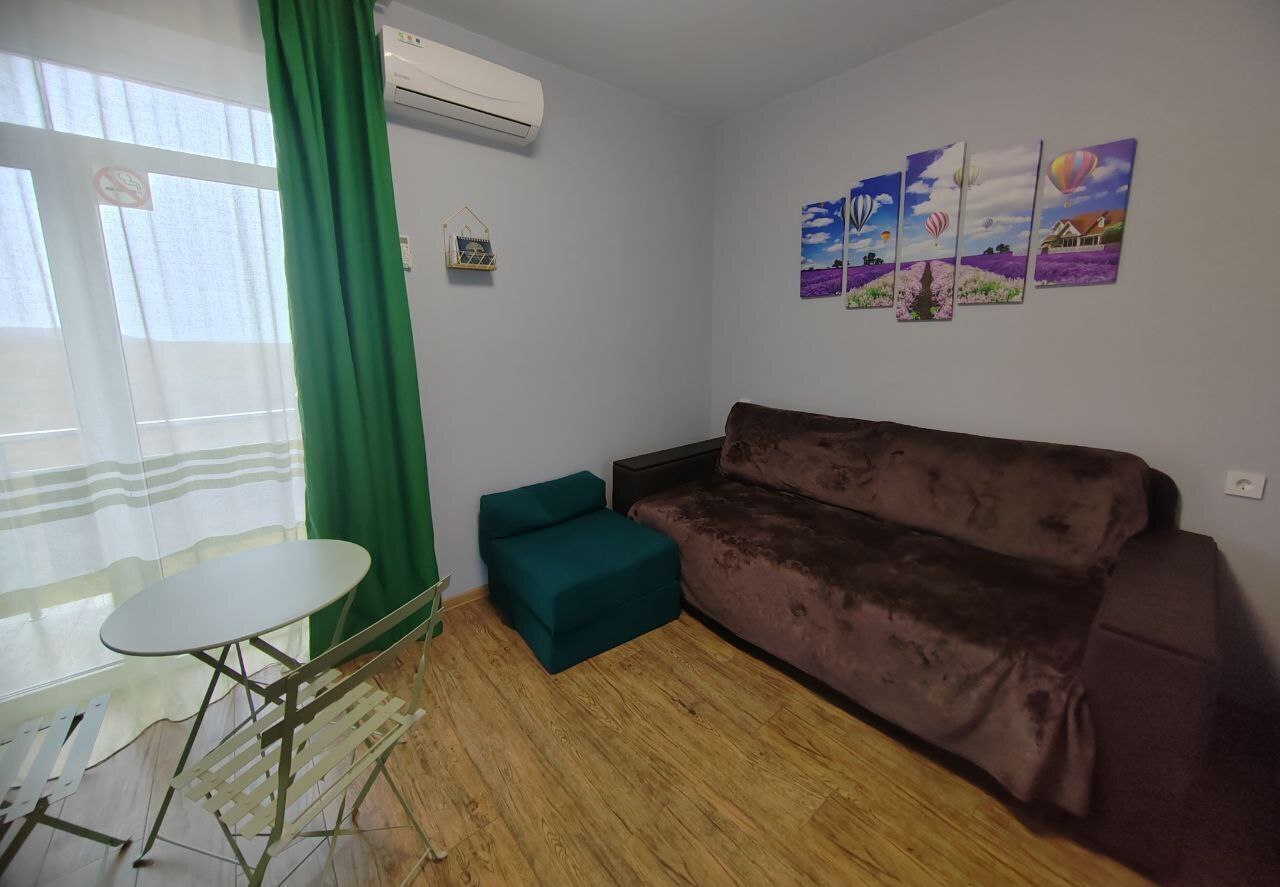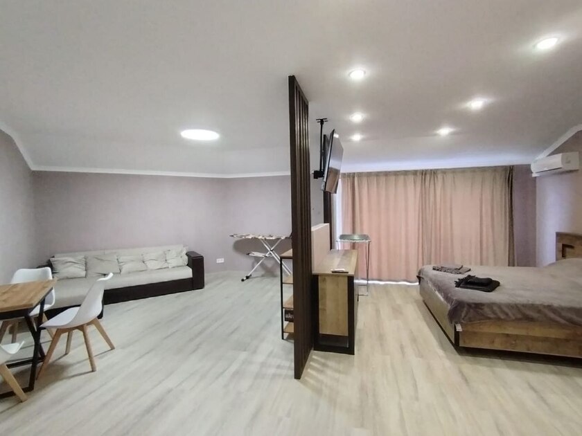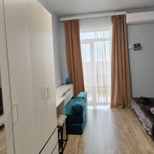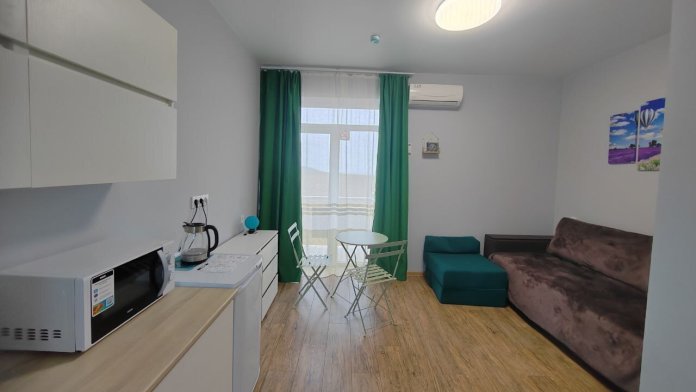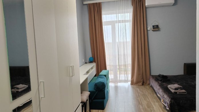 В этом варианте двуспальная кровать или комфортный раскладной диван. В номерах предусмотрено дополнительное спальное место очень комфортно отдыхать 2 взрослым и 1 ребенку. Рабочий стол, пуфик , шкаф для одежды, телевизор, кондиционер.Кухня-ниша, чайник, холодильник, микроволновая печь. Набор посуды на 3 персоны: десертные тарелки, плоские тарелки 28 см, суповые тарелки, столовые приборы, чайные пары, нож, вилки, ложки, разделочная доска, шкаф зеркало, полотенцесушитель, балкон