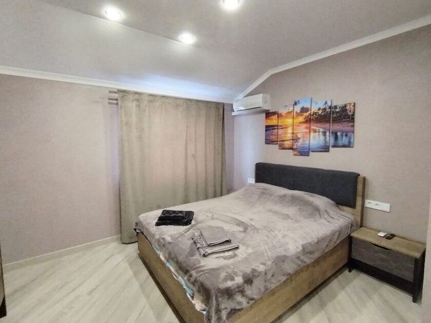 Просторные апартаменты включают два стильных санузла, один из которых оснащён стиральной машиной. В Вашем распоряжении два современных телевизора, которые позволят насладиться любимыми программами и фильмами в любой части номера. Три мощных кондиционера поддерживают идеальную атмосферу и комфорт в каждой комнате. Кухня оборудована всем необходимым: от современной плиты до вместительного холодильника и полного набора кухонных принадлежностей. Для отдыха предусмотрены две двуспальные кровати и двуспальный диван, обеспечивающие уют и расслабление.