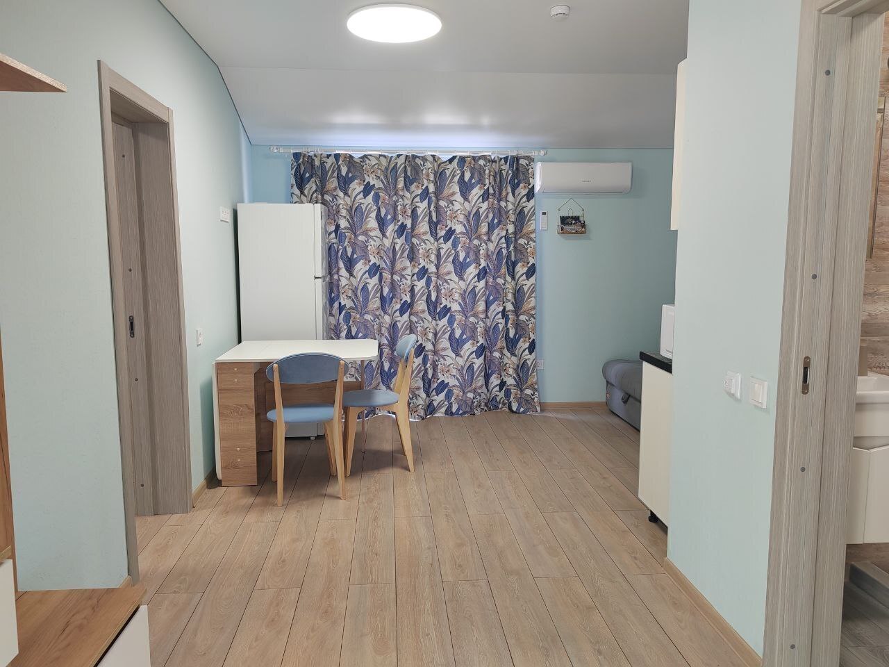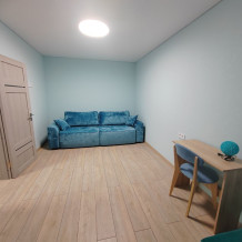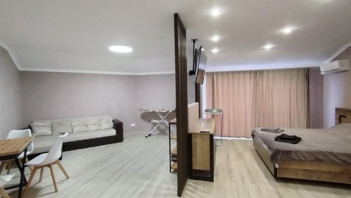 В номерах места хватит для 2 взрослых и до 2 детей. В этом варианте двуспальная кровать и дополнительные комфортные спальные места предусмотрены. Рабочий стол, пуфик, шкаф для одежды, телевизор, кондиционер. Полноценная кухня, чайник, холодильник, микроволновая печь, вытяжка, обеденный стол. Набор посуды на 5 персон. Шкаф-зеркало, полотенцесушитель.