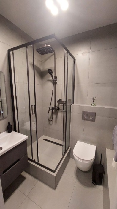 Ванная комната с душем и всеми средствами гигиены.