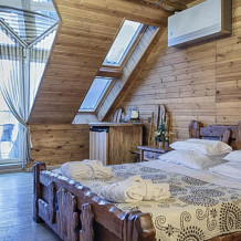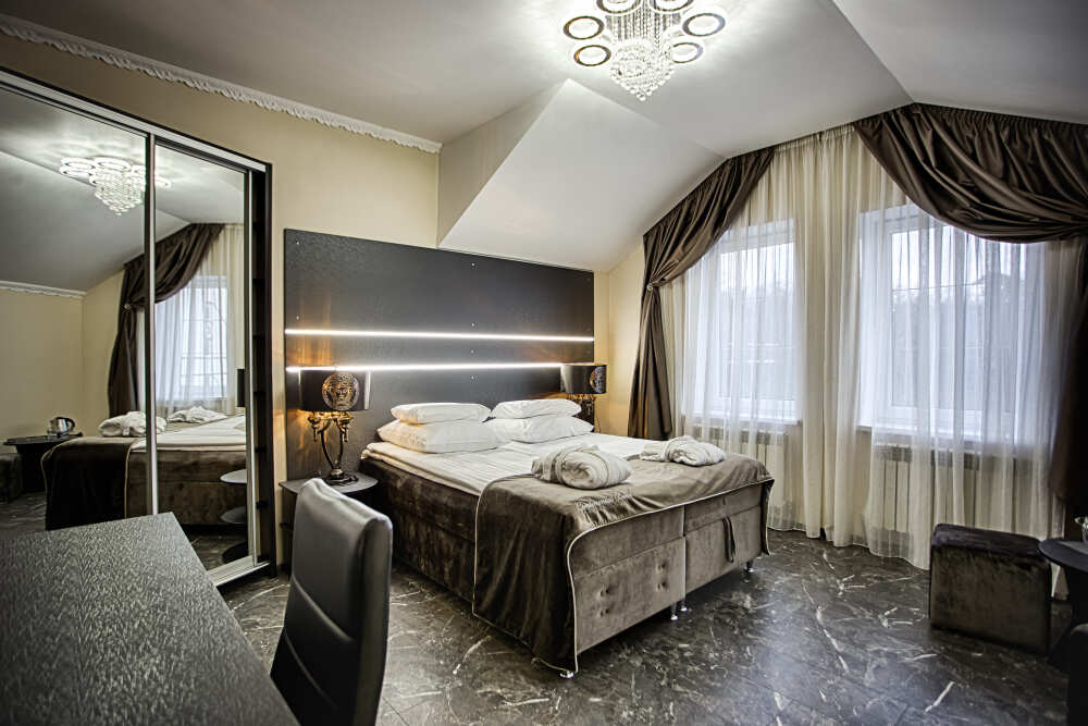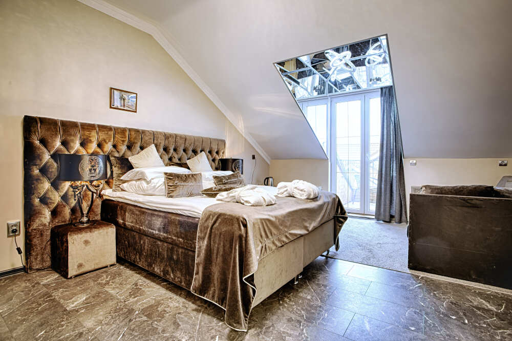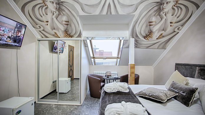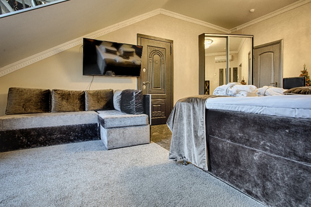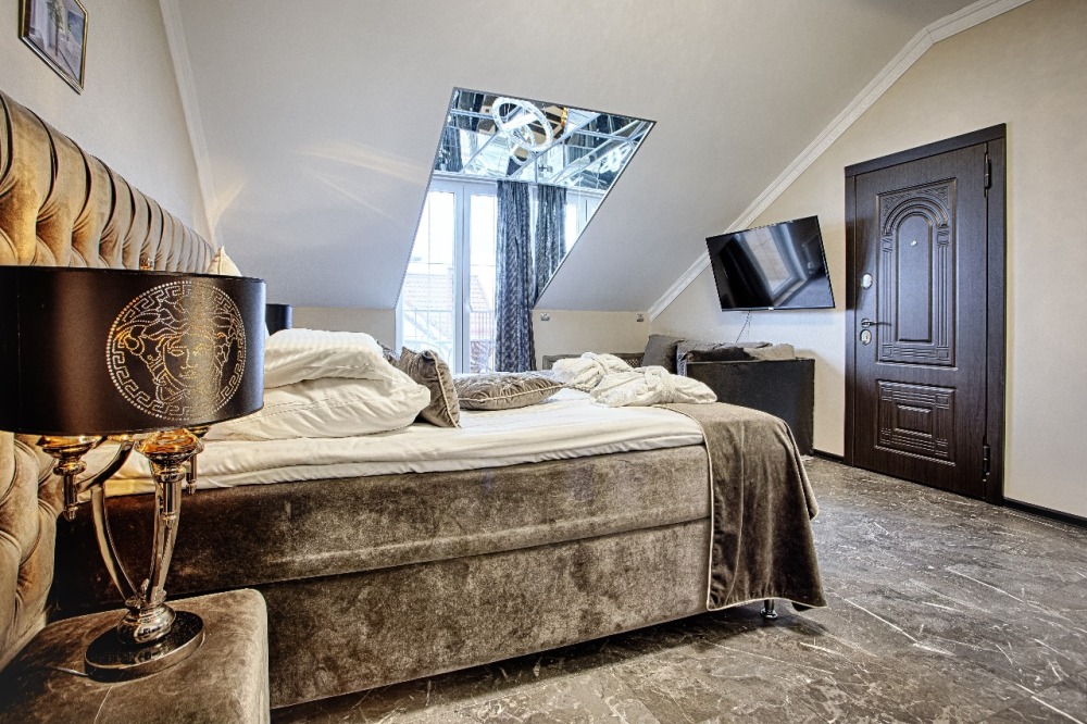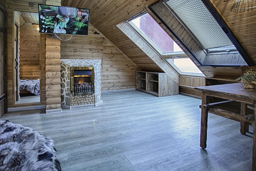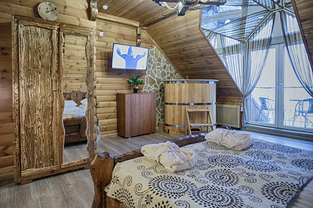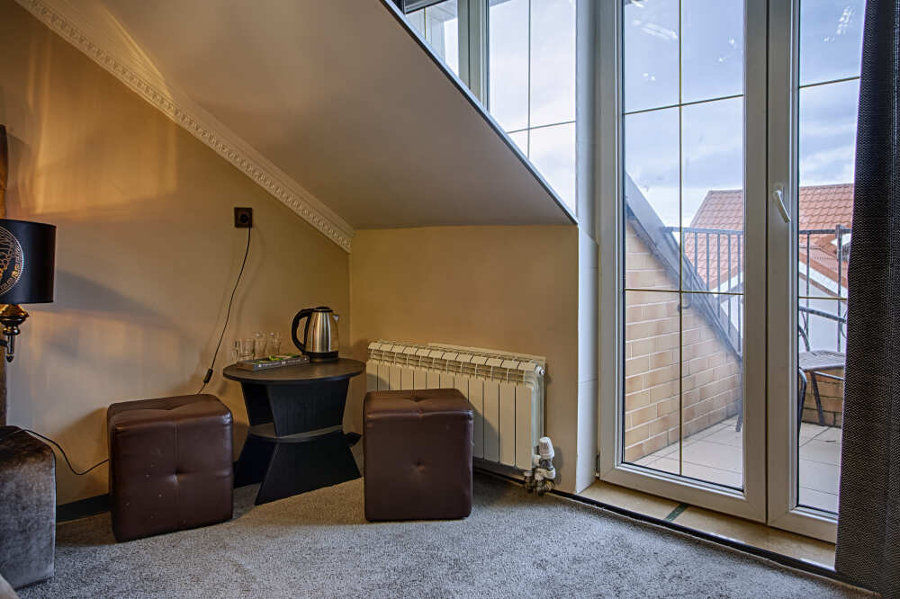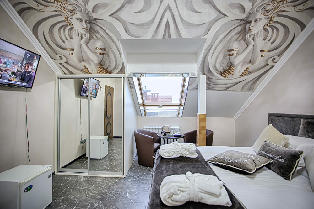 Двухэтажный люкс. (3 этаж +мансарда). угловой диван, полный санузел, большой телевизор, кондиционер, вид на парк, комната 20м2, мансарда 25м2,большая круглая кровать, телевизор, столик со стульями, камин, Выдвижной балкон, камин 4d. Неполный санузел (раковина, туалет). В интерьере номера гармонично сочетаются характерные стилистические элементы и современное оснащение Все номера для некурящих. 3 этаж, мансарда.