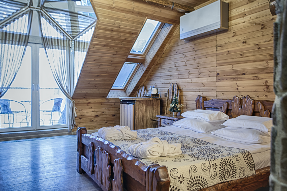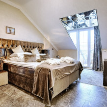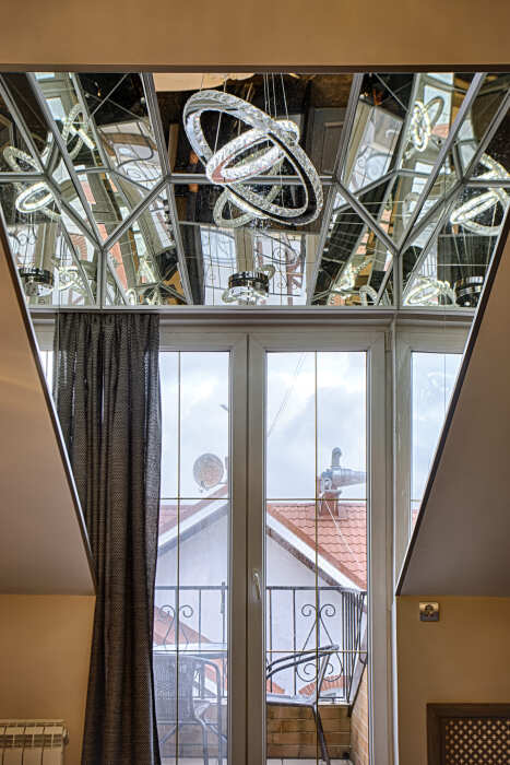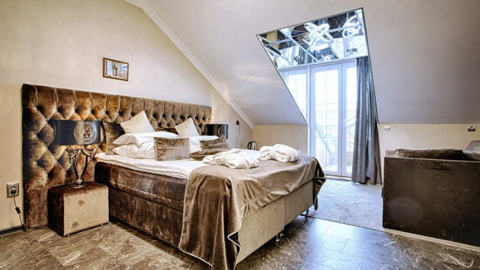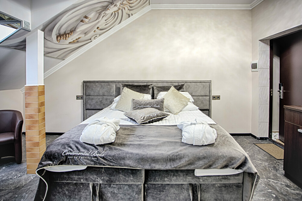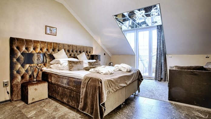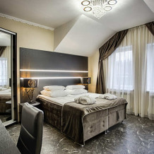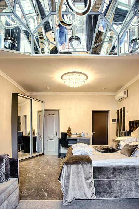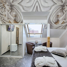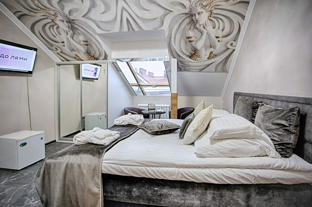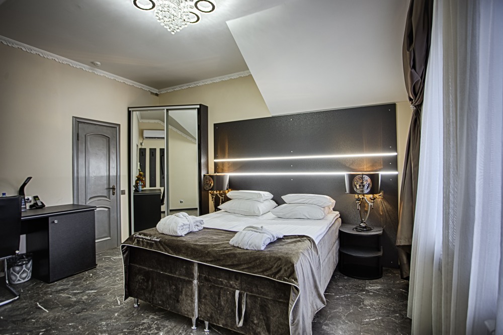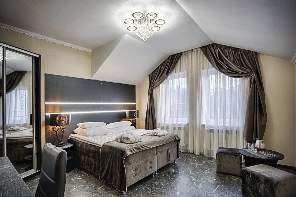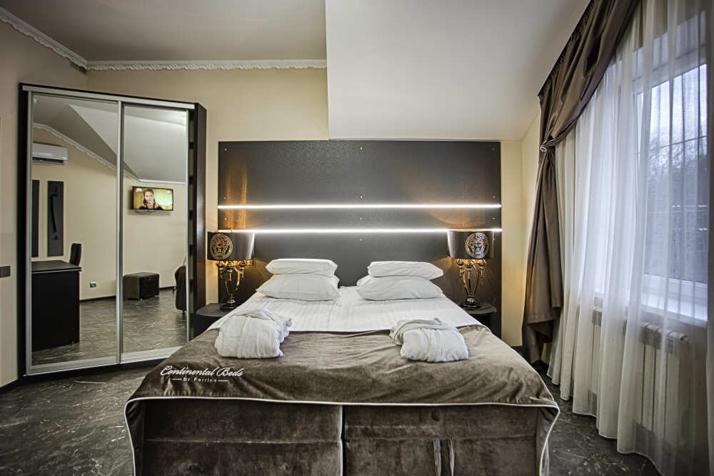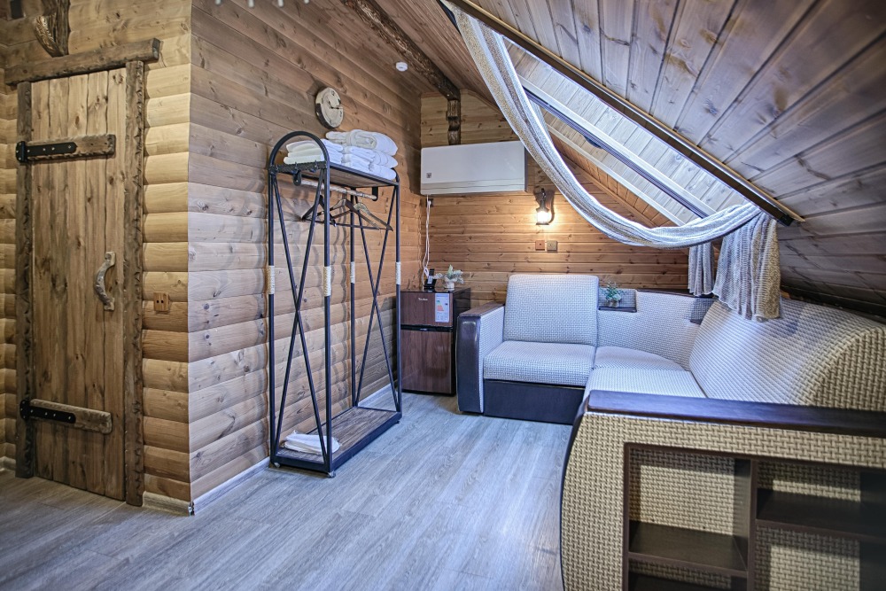 Двухэтажный люкс. (3 этаж +мансарда). угловой диван, полный санузел, большой телевизор, кондиционер, вид на парк, комната 20м2, мансарда 25м2,большая круглая кровать, телевизор, столик со стульями, камин, Выдвижной балкон, камин 4d. Неполный санузел (раковина, туалет). В интерьере номера гармонично сочетаются характерные стилистические элементы и современное оснащение Все номера для некурящих. 3 этаж, мансарда.