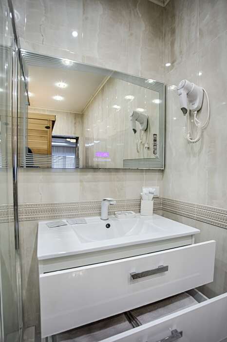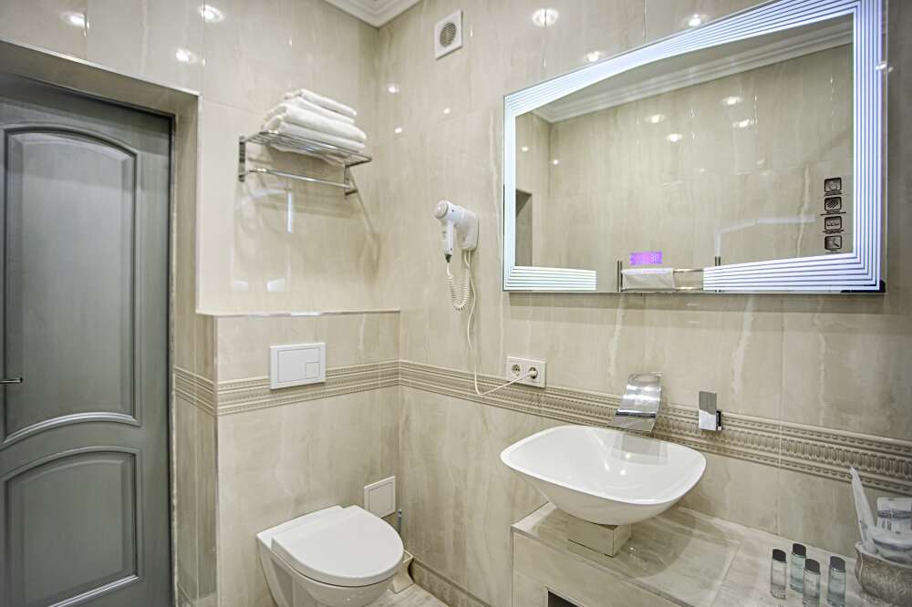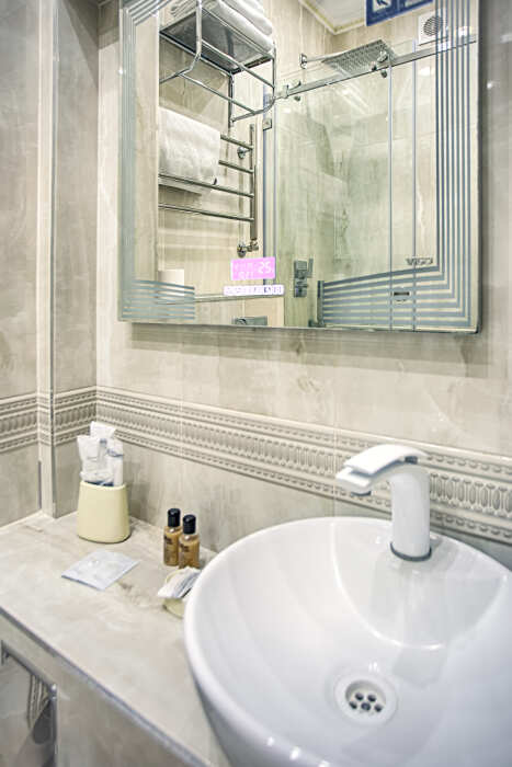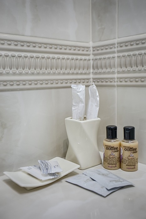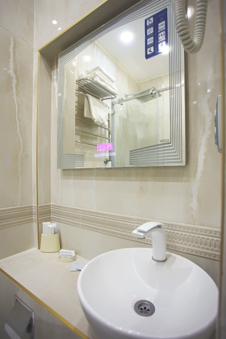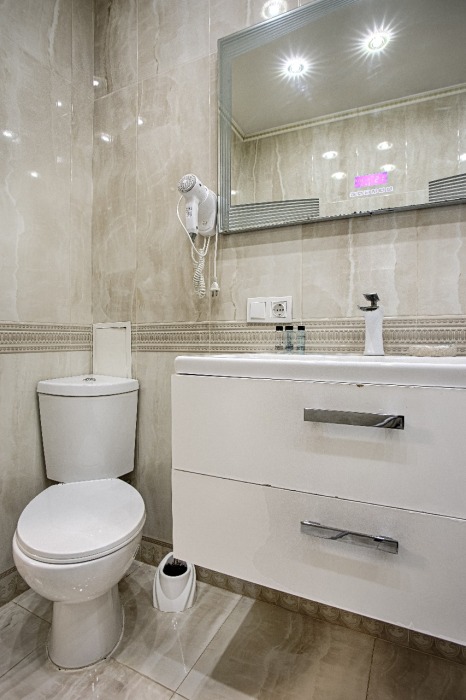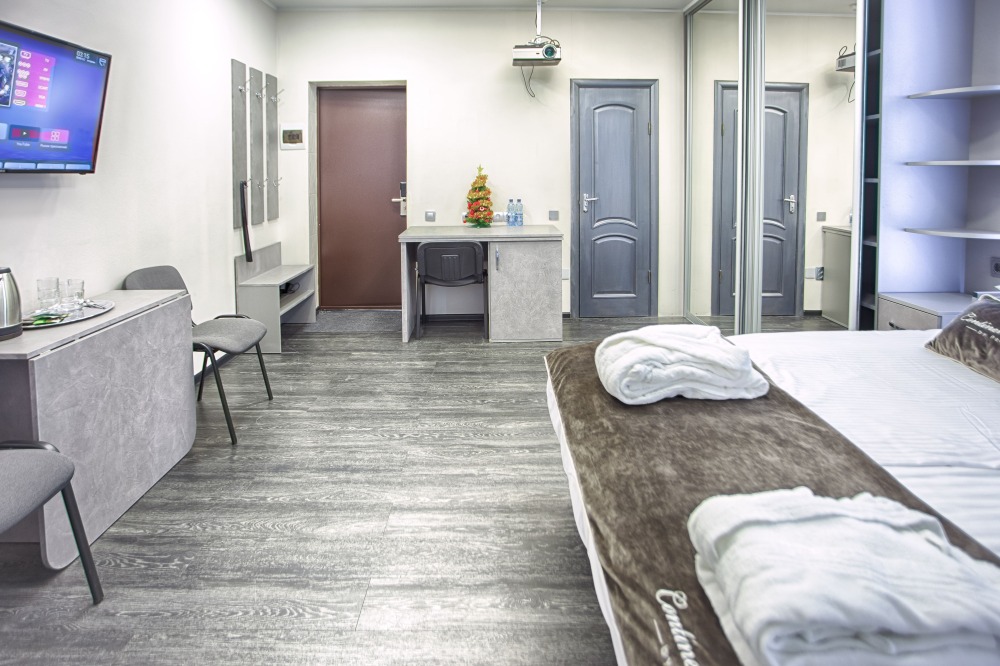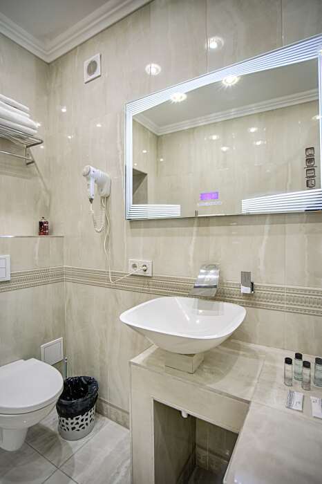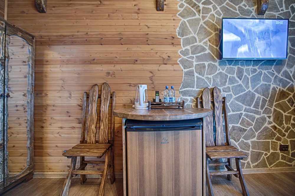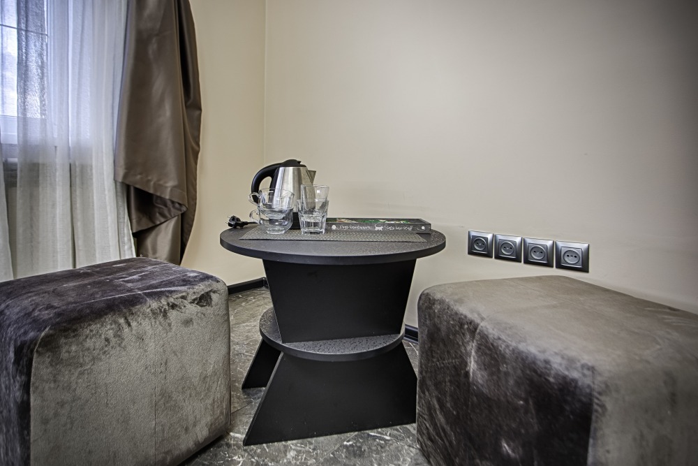 холодильник, чайник. В интерьере номера гармонично сочетаются