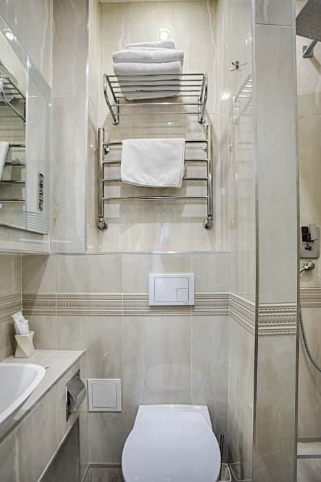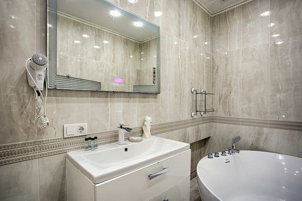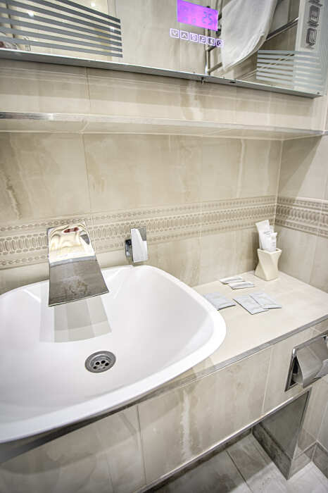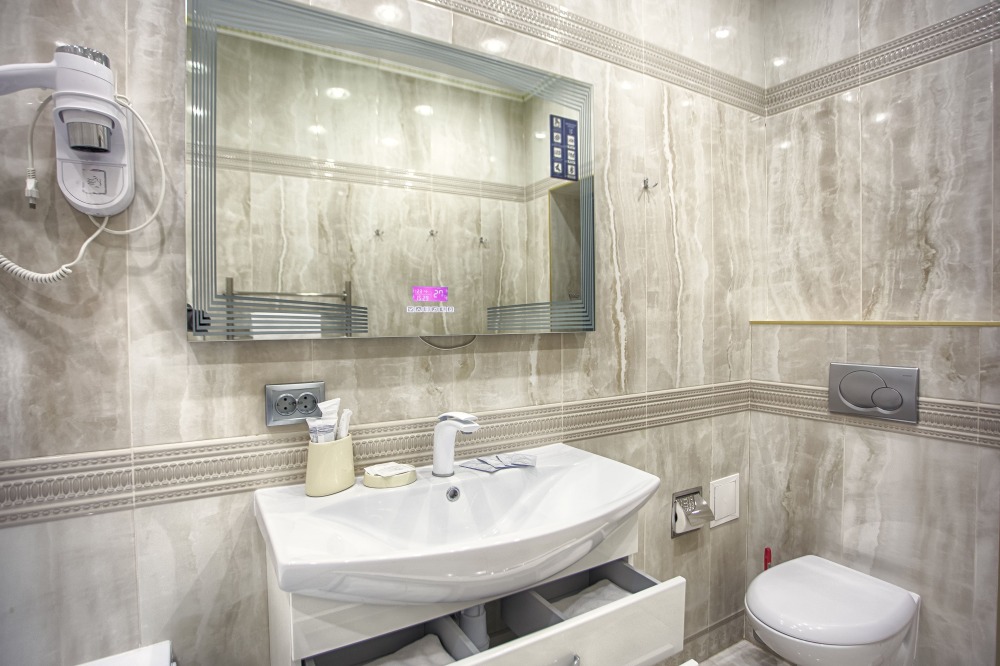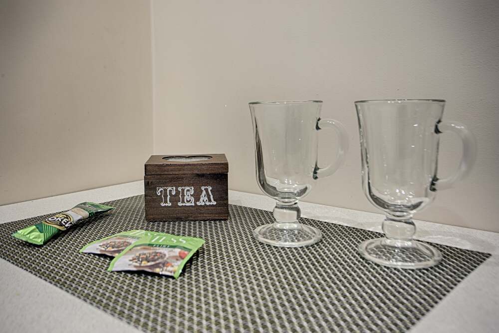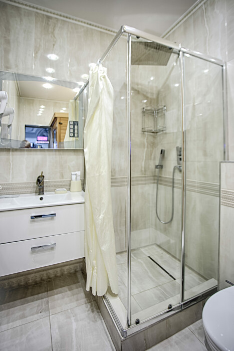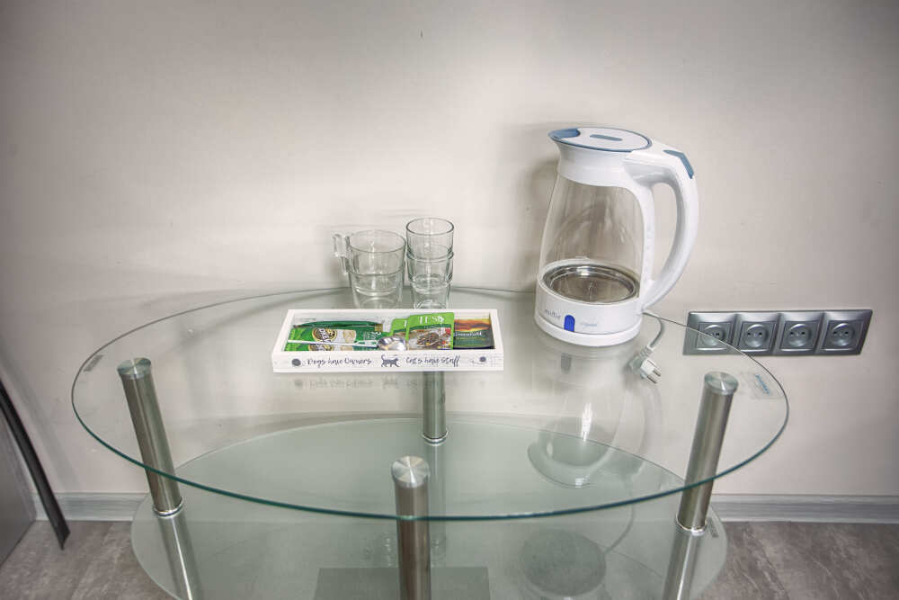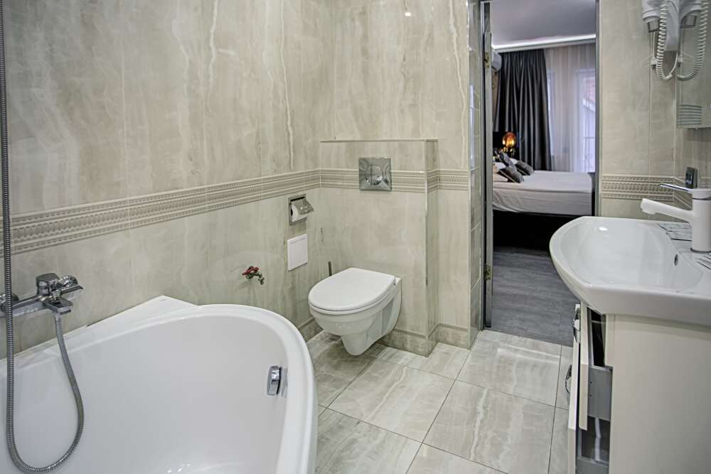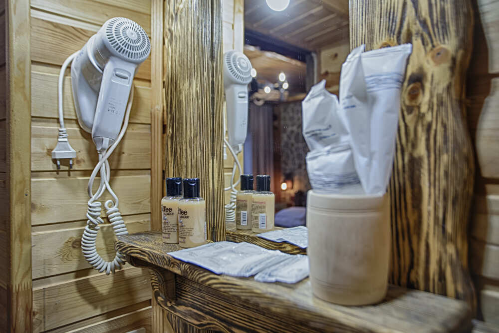 холодильник, чайник. В интерьере номера гармонично сочетаются