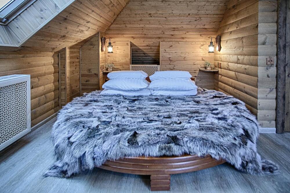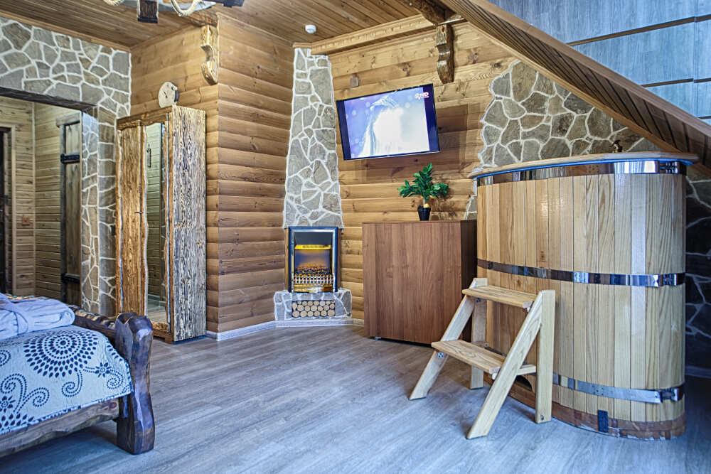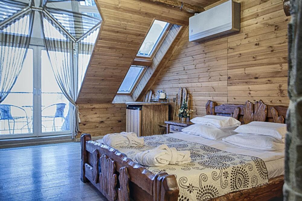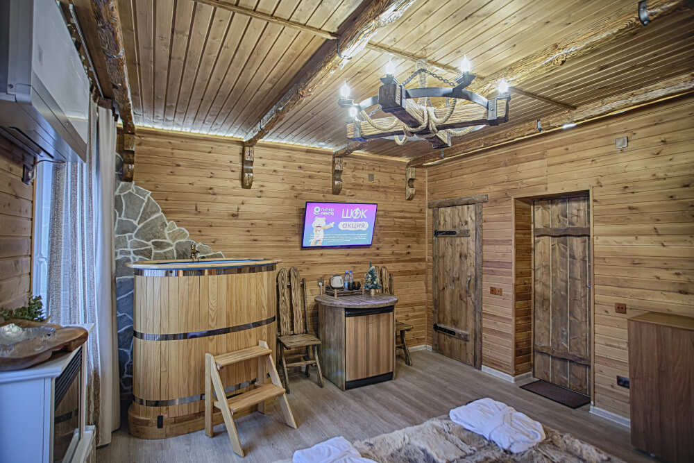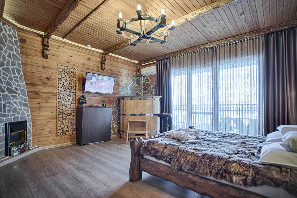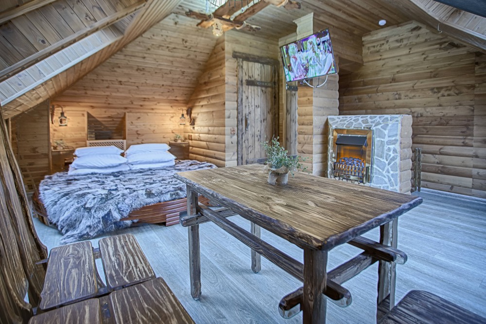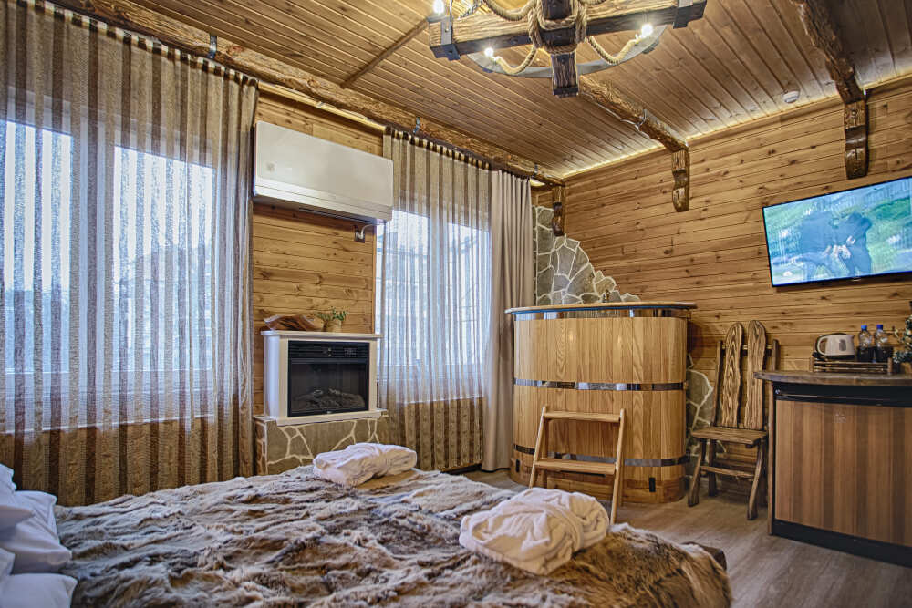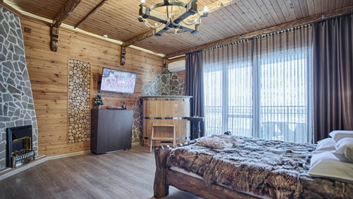 Второй этаж. Вид на город. Широкая кровать. Большой телевизор, холодильник, кондиционер, купель, камин 3d, стол, стулья.