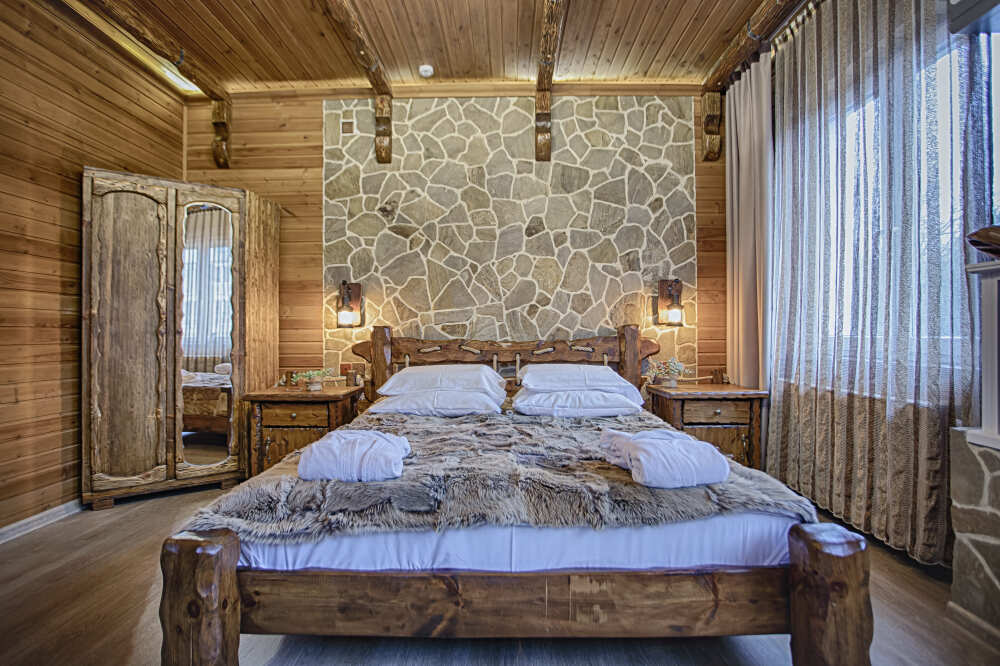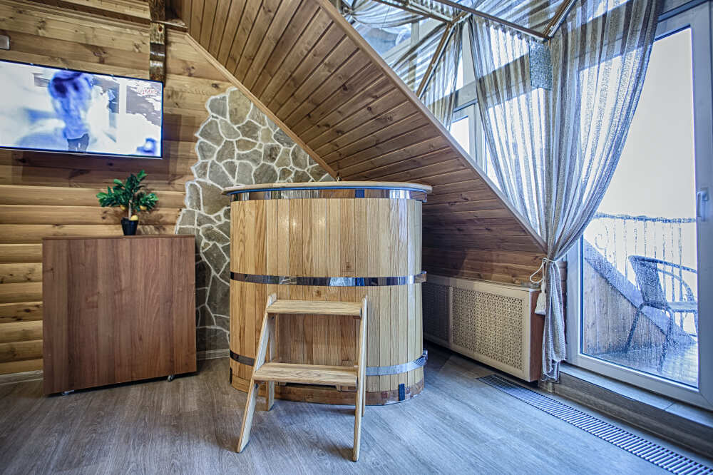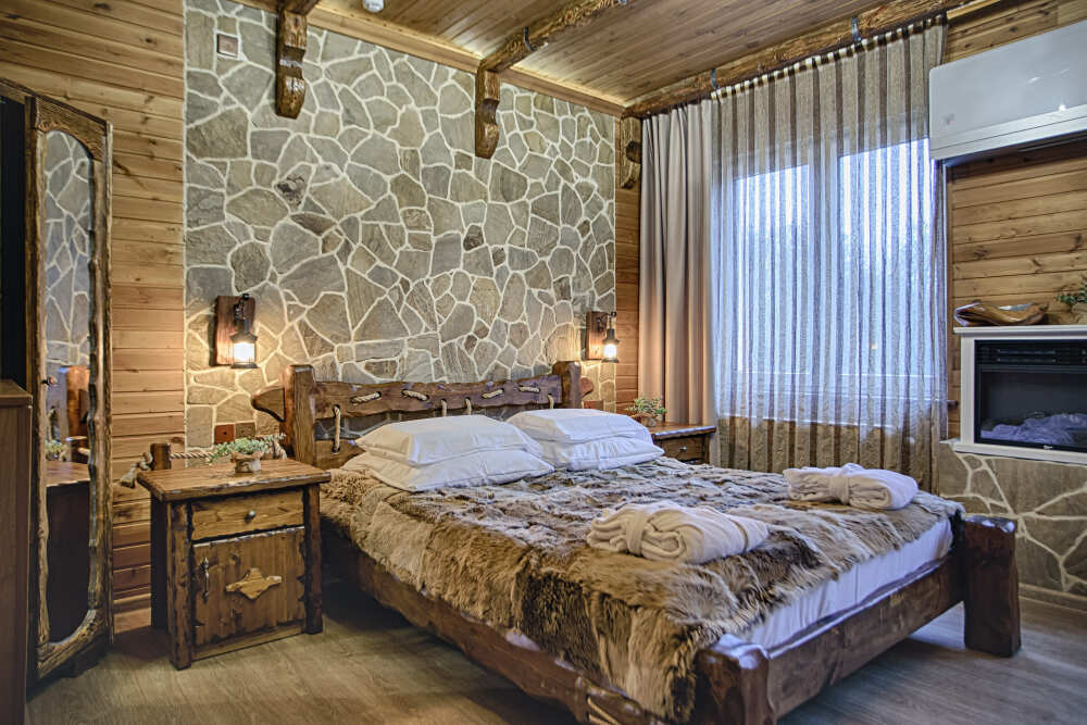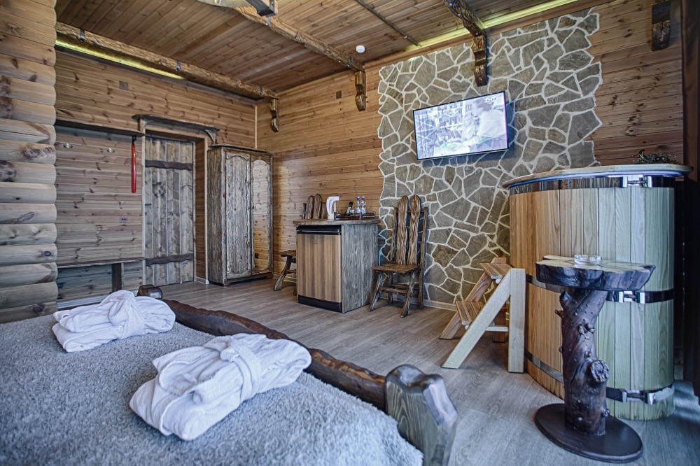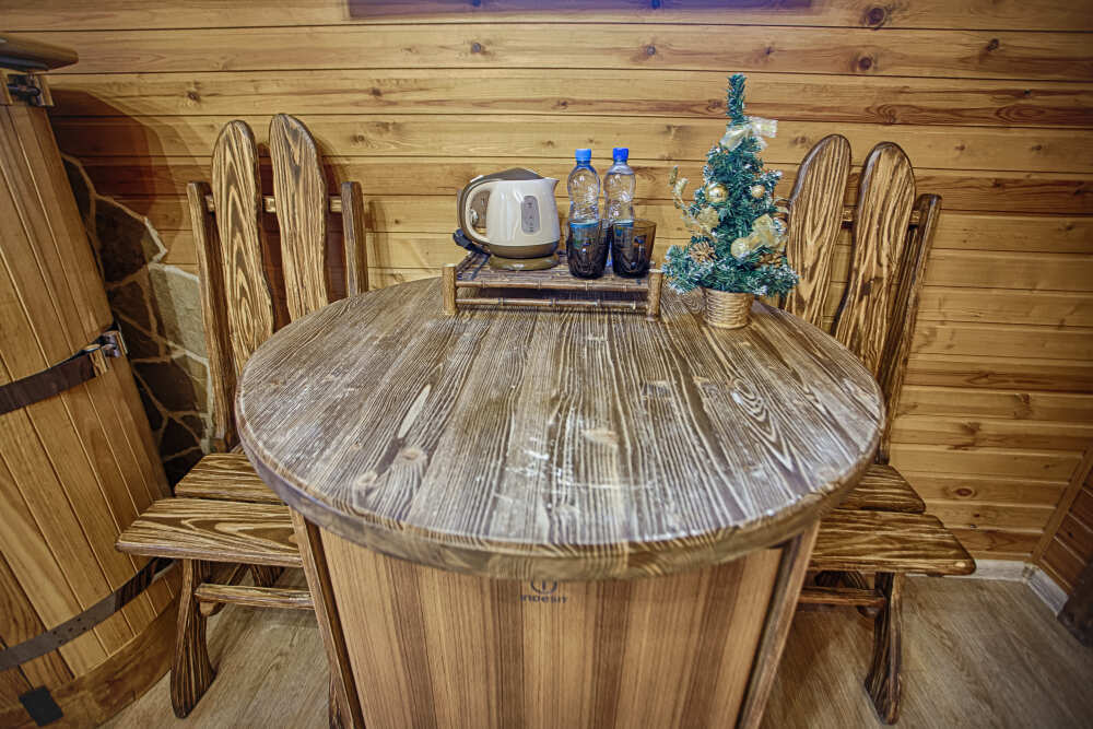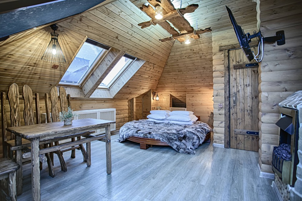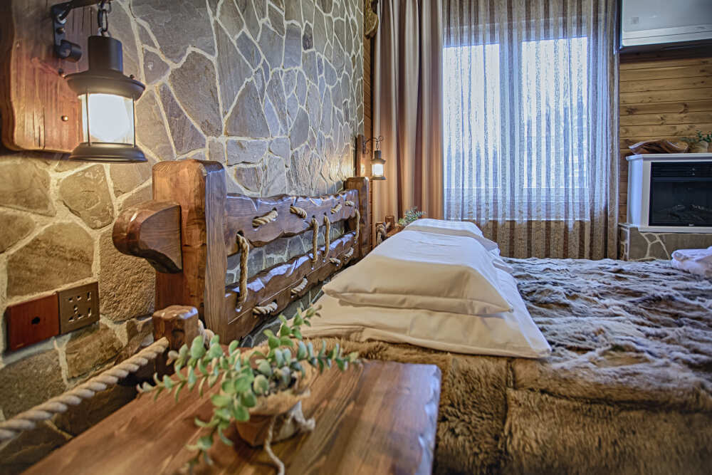 Второй этаж. Вид на город. Широкая кровать. Большой телевизор, холодильник, кондиционер, купель, камин 3d, стол, стулья.