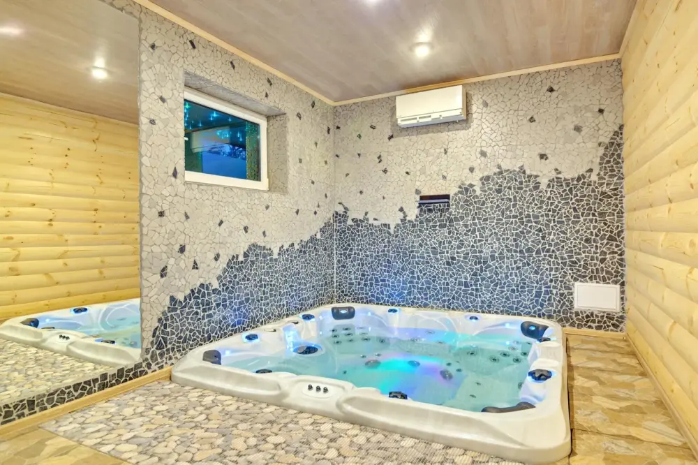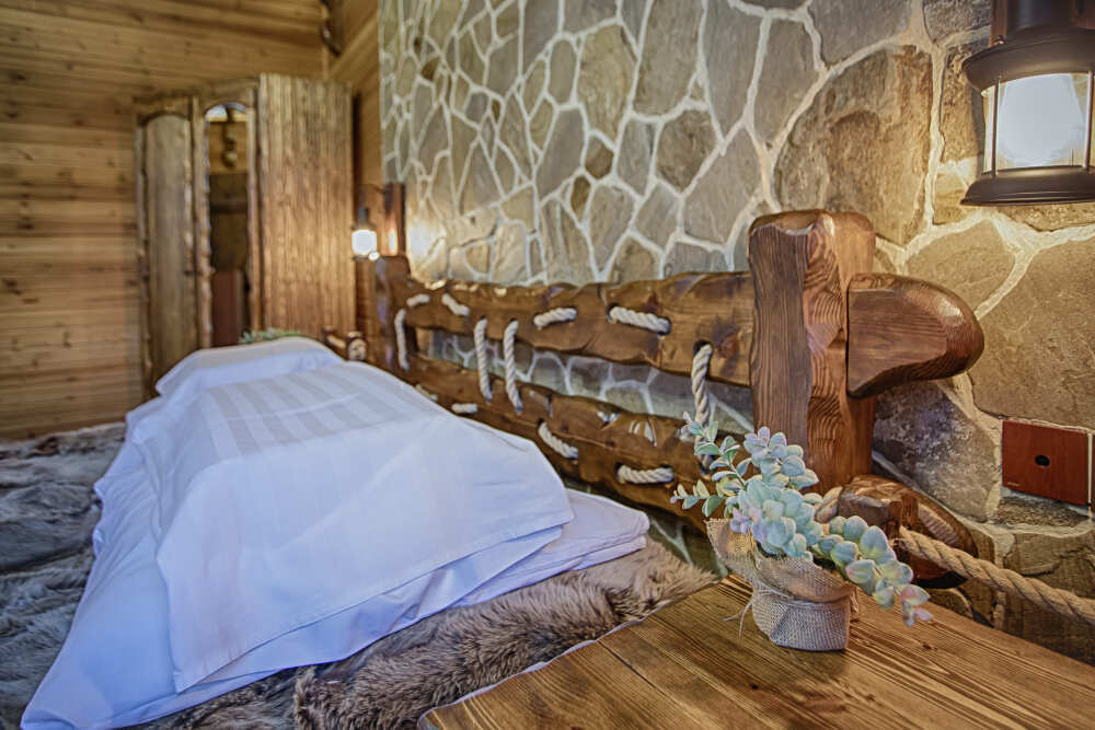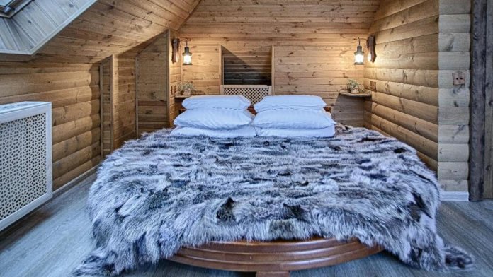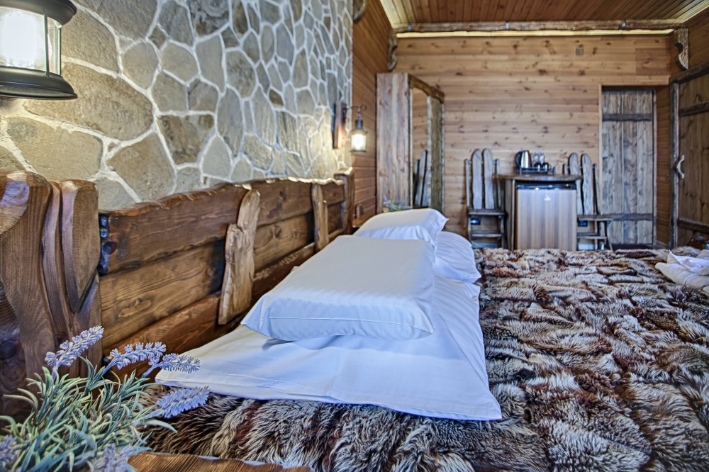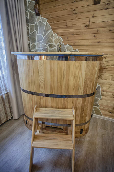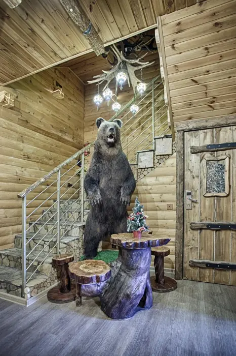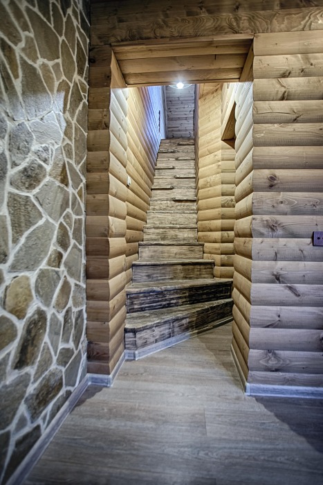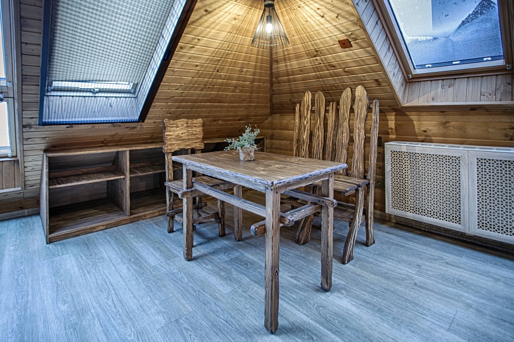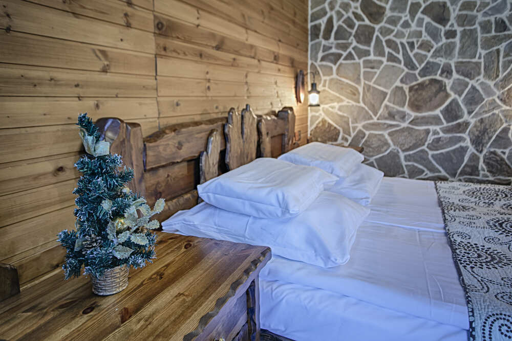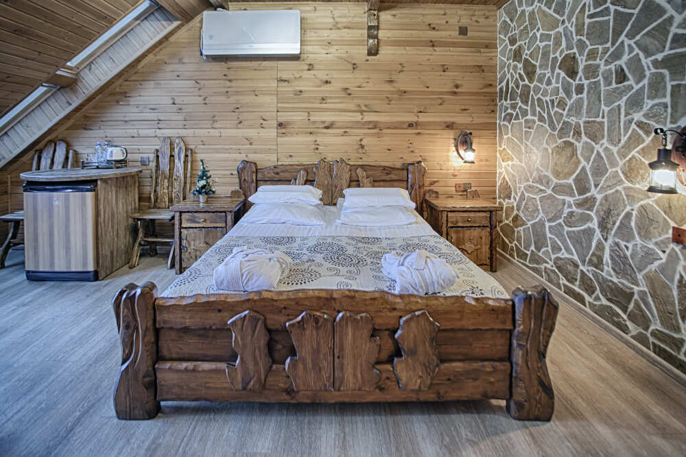 Второй этаж. Вид на город. Широкая кровать. Большой телевизор, холодильник, кондиционер, купель, камин 3d, стол, стулья.
