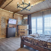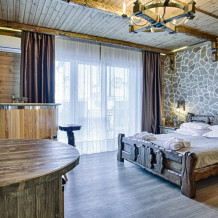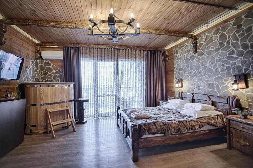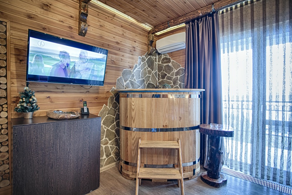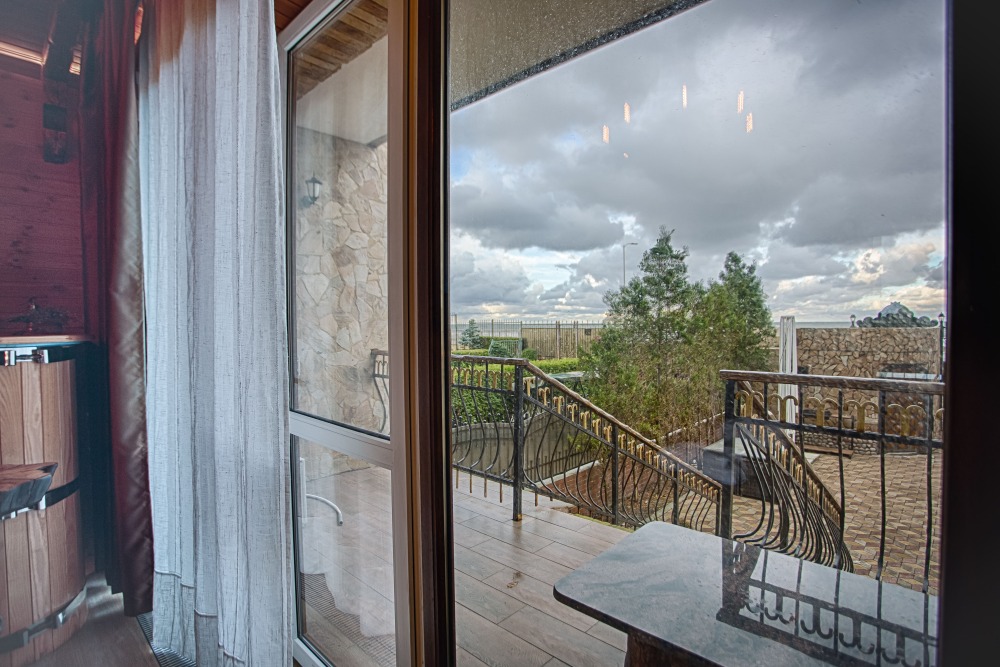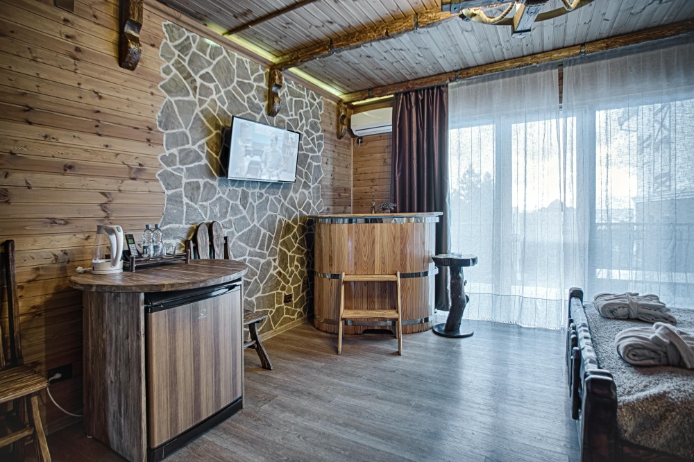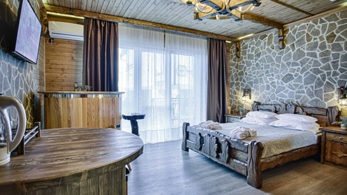 Второй этаж. Вид на море. Большой балкон. Широкая кровать. Большой телевизор, холодильник, кондиционер, купель, камин 4d, стол, стулья. В интерьере номера гармонично сочетаются характерные стилистические элементы и современное оснащение Все номера для некурящих.