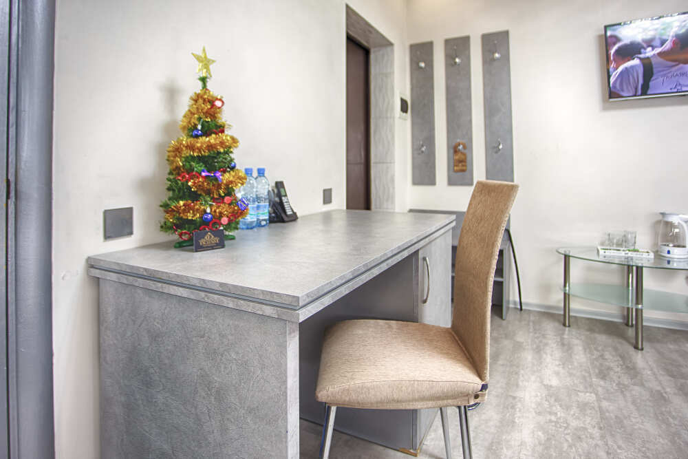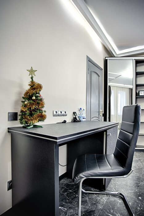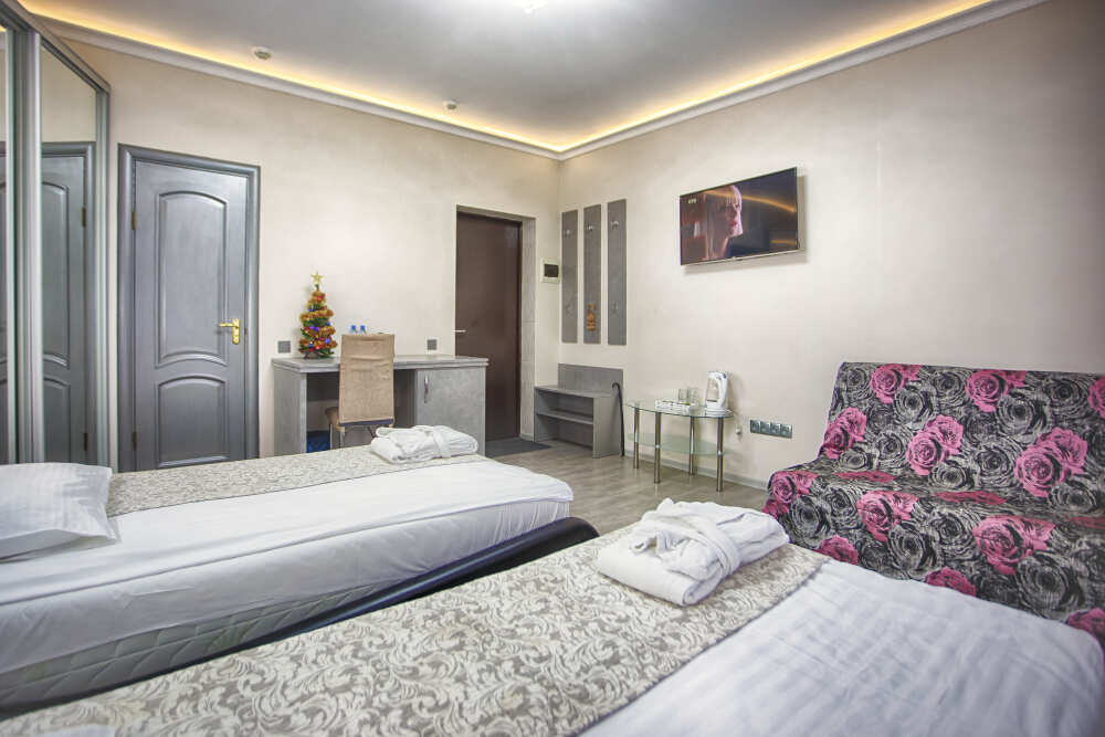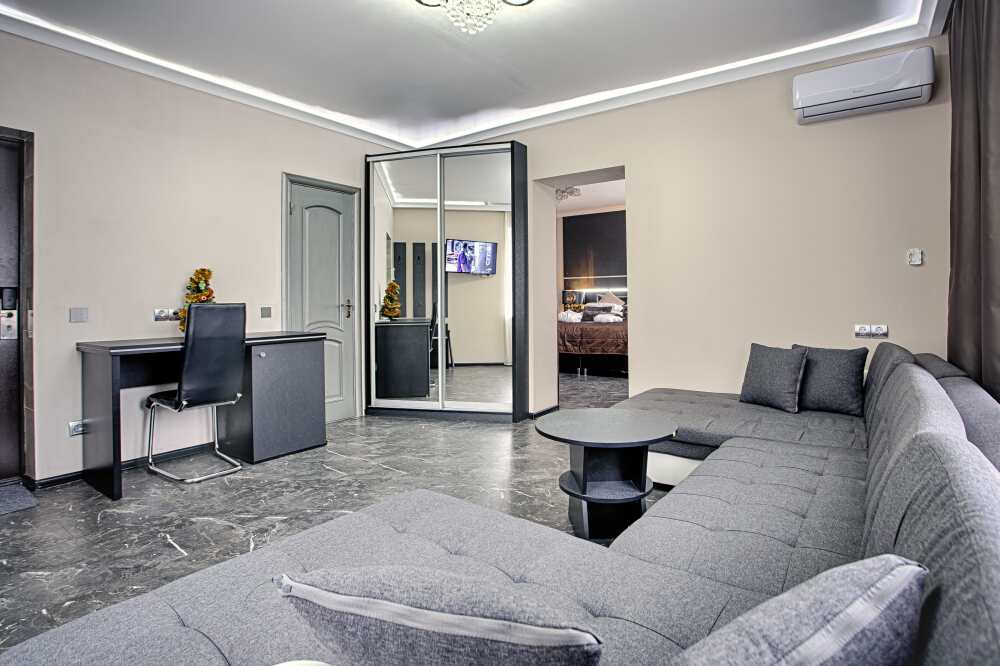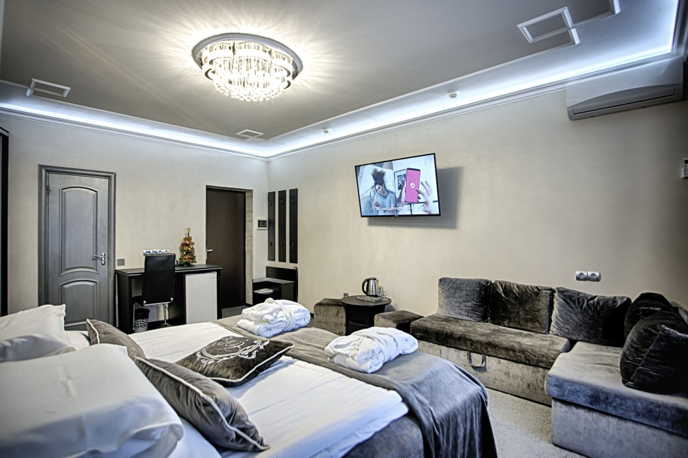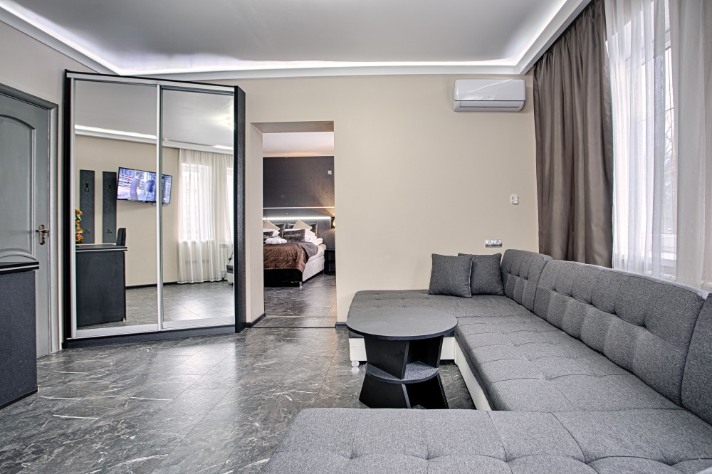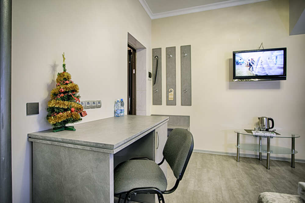 Также в номере есть холодильник для хранения продуктов, большой плазменный телевизор и кондиционер. Есть большой обеденный стол на 4 человека, а также маленький журнальный столик. Номер пользуется большой популярностью у постояльцев нашего отеля, поэтому если Вы хотите разместиться именно в нём - советуем Вам бронировать его заранее. 2 этаж, вид на парк.