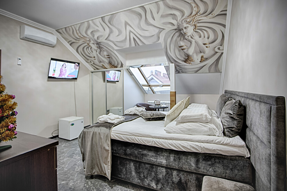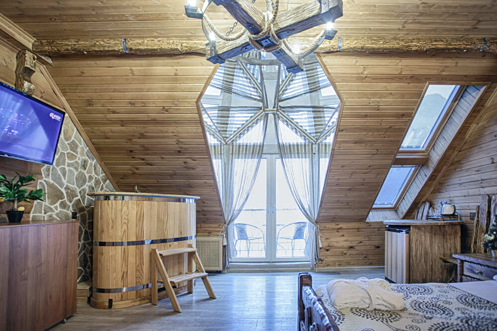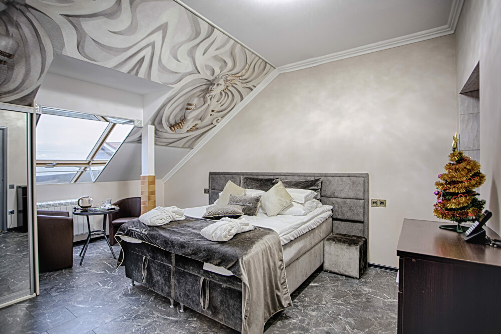 Третий этаж. Вид на море. Маленький балкон. Широкая кровать. Большой телевизор, холодильник, кондиционер, купель, камин 4d, стол, стулья. В интерьере номера гармонично сочетаются характерные стилистические элементы и современное оснащение Все номера для некурящих 3 этаж, Мансарда