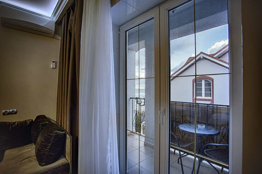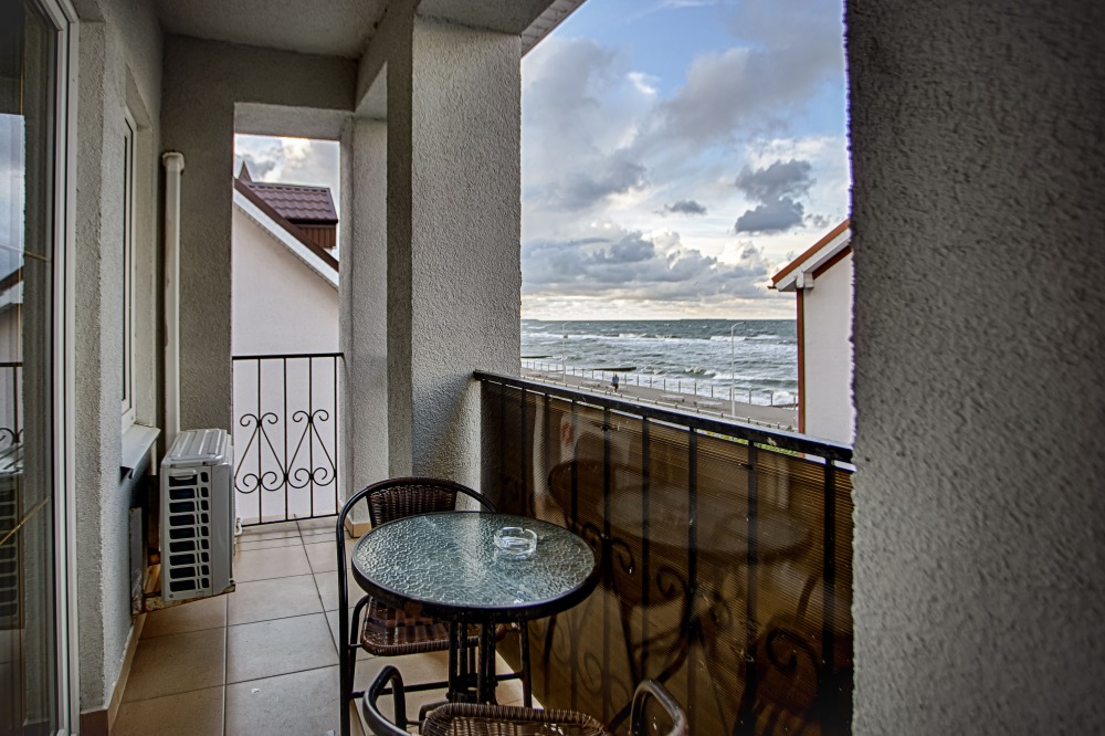 Высокий первый этаж. Вид на море. Собственный выход во двор. Большой балкон. Широкая кровать. Большой телевизор, холодильник, кондиционер, купель, стол, стулья. В интерьере номера гармонично сочетаются характерные стилистические элементы и современное оснащение Все номера для некурящих. 1 этаж.