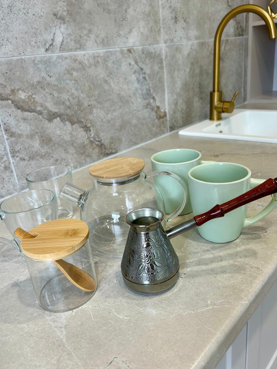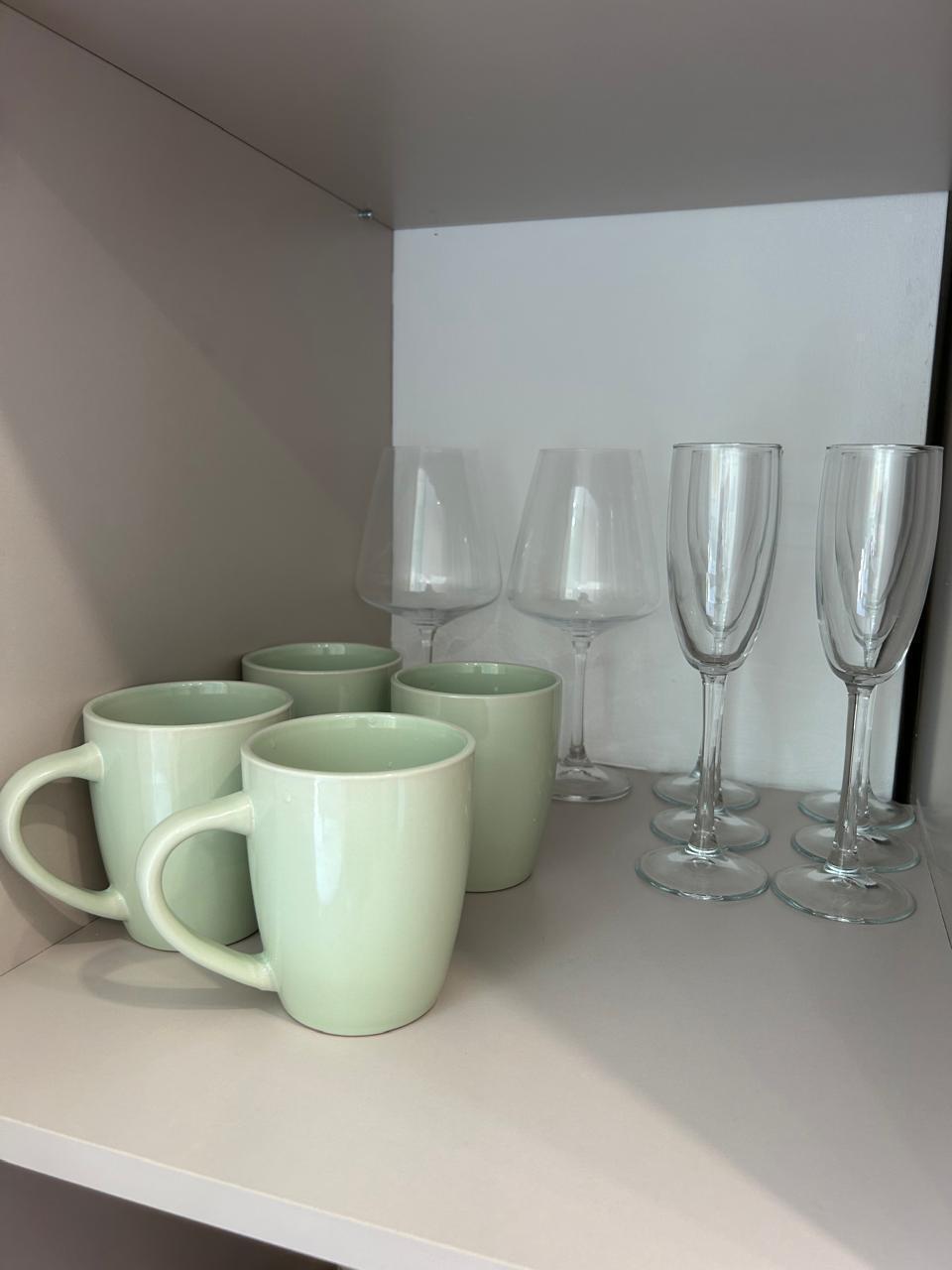 На кухне современная удобная мебель, холодильник, микроволновка, газовая варочная панель, духовой шкаф, электрочайник, вся посуда для приготовления, набор посуды, бокалов, столовых приборов.