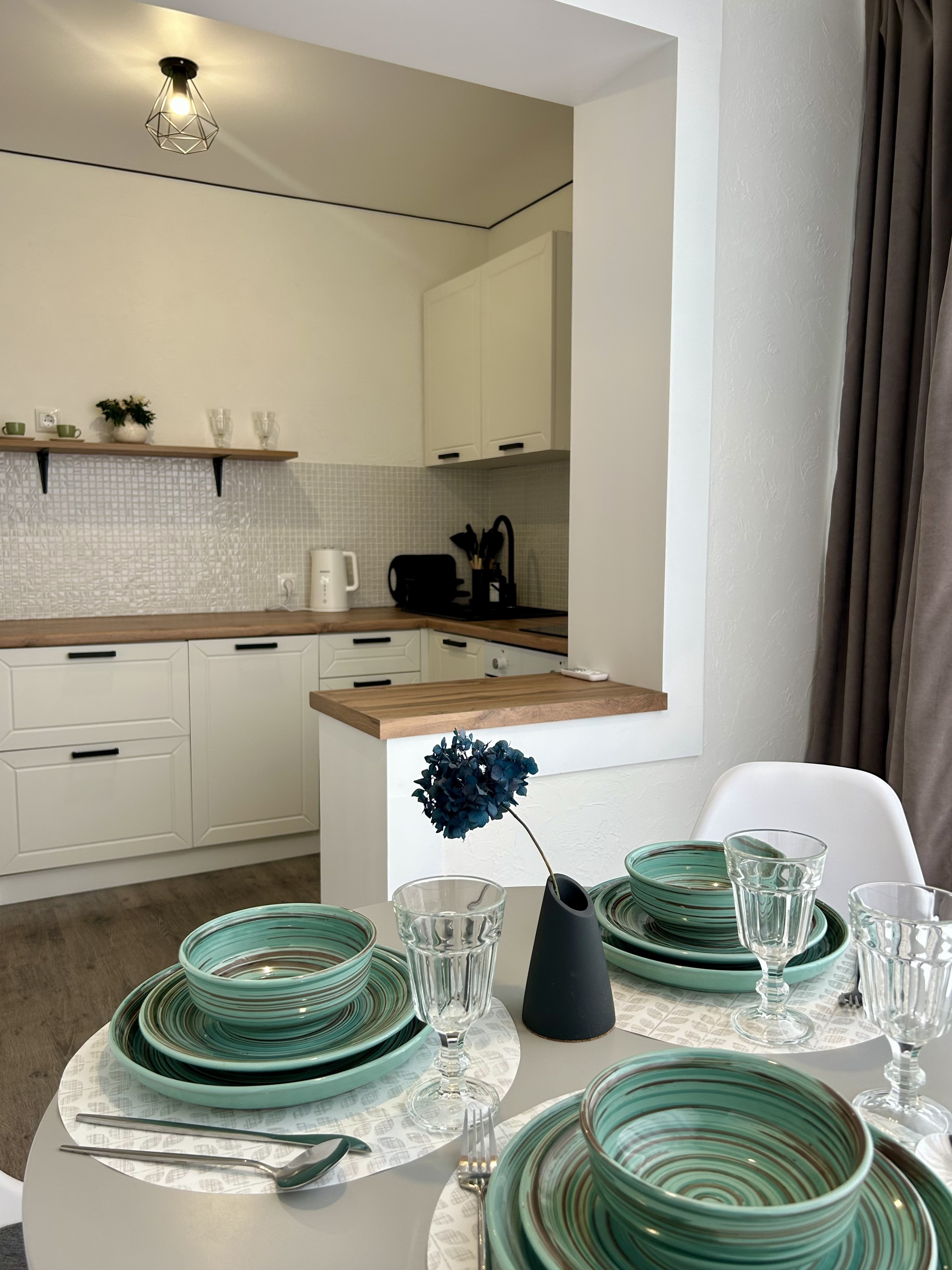 На кухне современная удобная мебель, посудомоечная машина, холодильник, микроволновка, варочная панель, духовой шкаф, электрочайник, вся посуда для приготовления, набор посуды, бокалов, столовых приборов.
