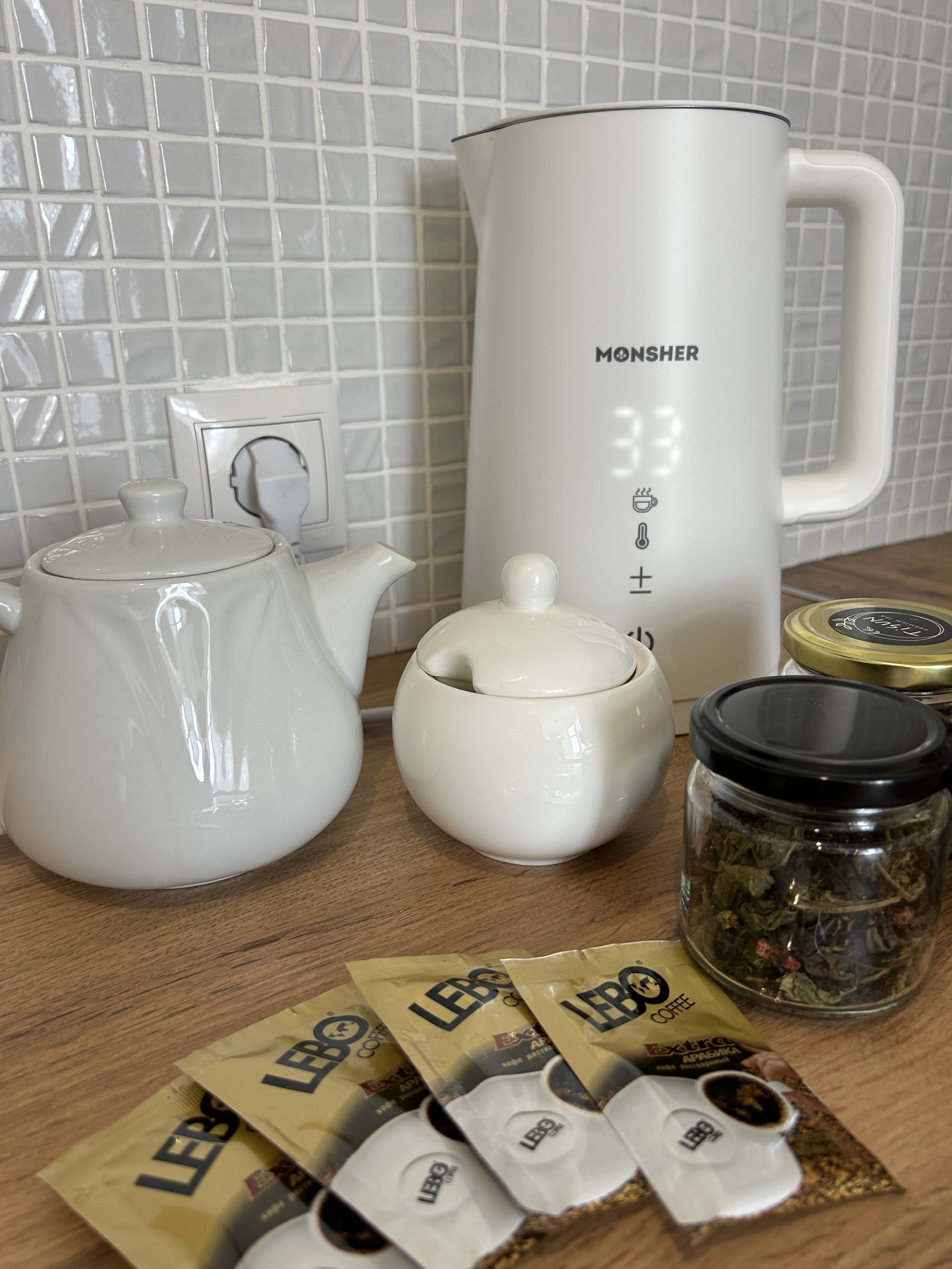 Для каждого гостя: одноразовые тапочки, зубной набор, мыло, шампунь, кондиционер, гель для душа.