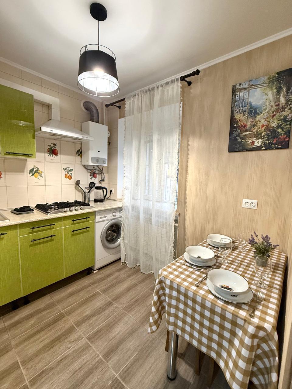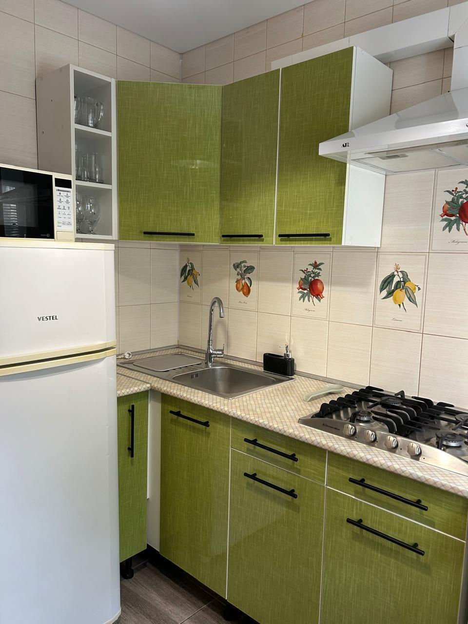 Кухня оснащена: современная мебель, холодильник, микроволновка, газовая варочная поверхность, электрочайник, вся посуда для приготовления, набор посуды, бокалов, столовых приборов.