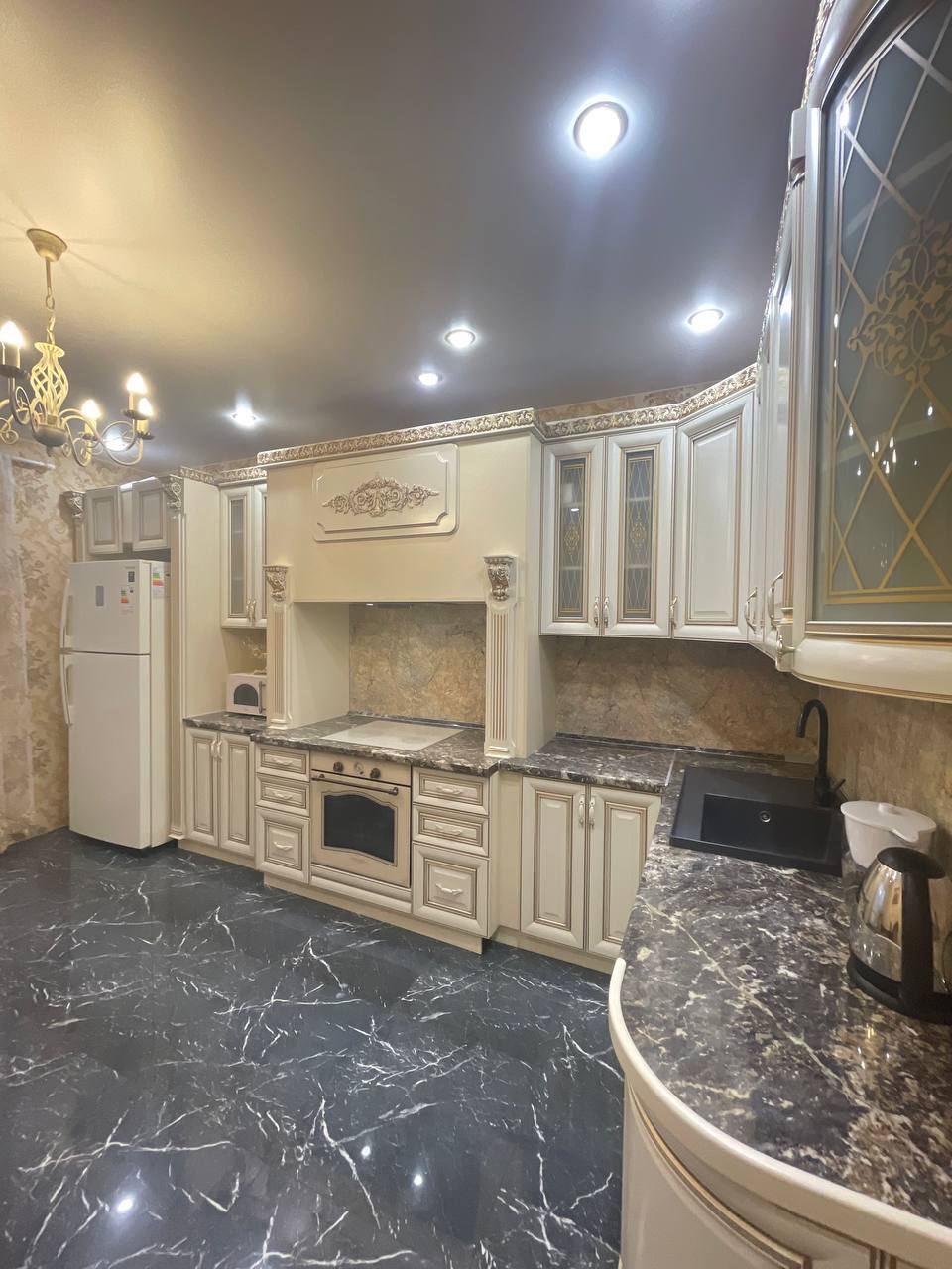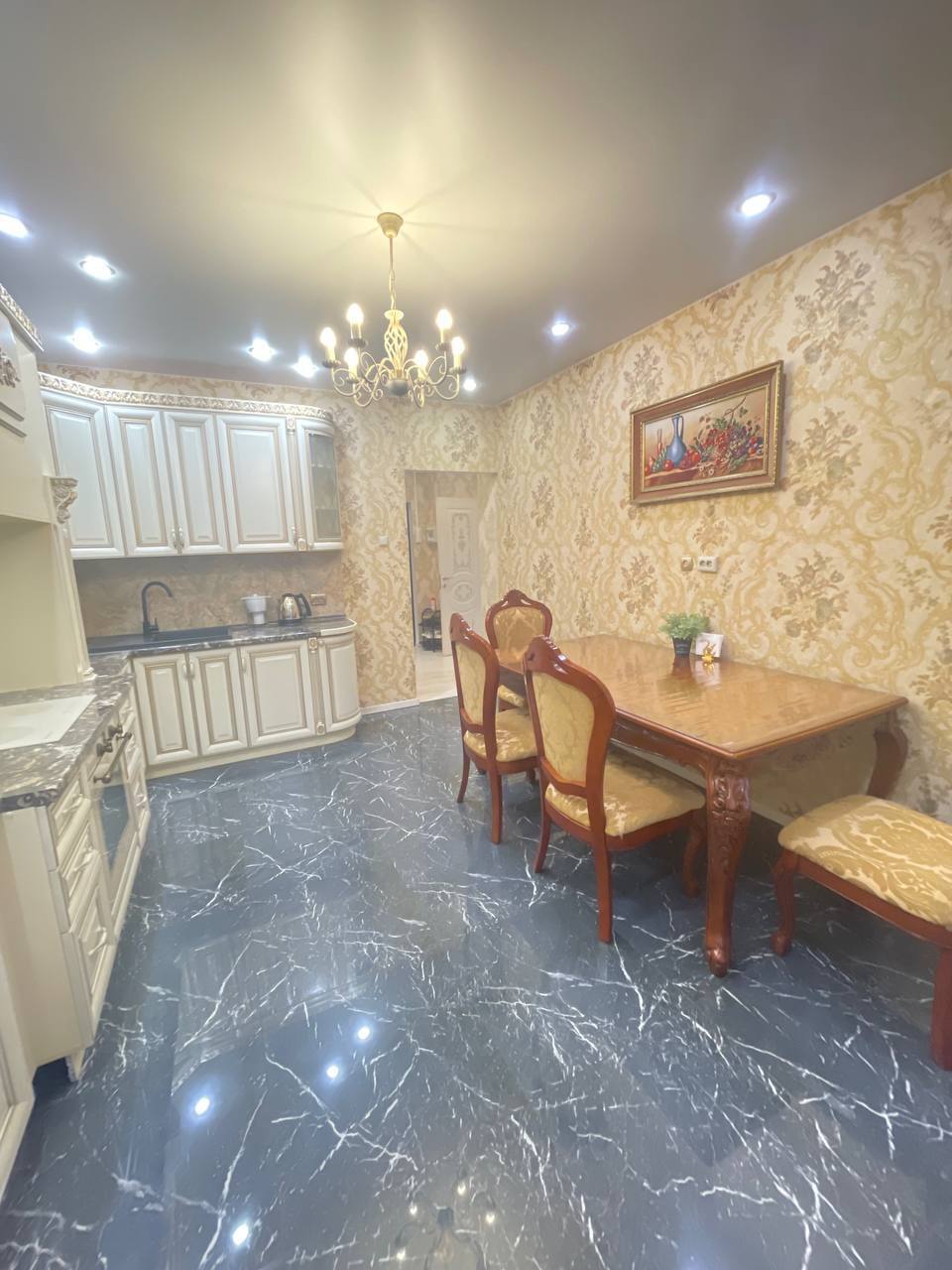 Комфортабельная кухня с большим деревянным столом, идеальное место для завтраков и ужинов. Здесь есть всё необходимое для приготовления вкуснейших блюд: сенсорная варочная панель, духовка, чайник, полный комплект посуды. А ещё фены, стиральная машина и удобные сушилки для белья!