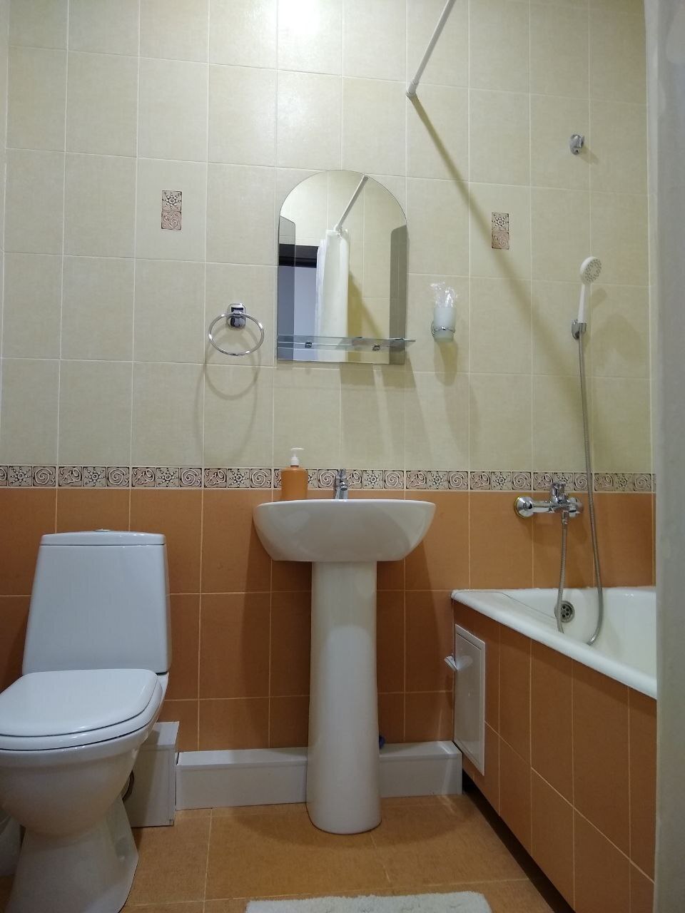 В санузле - средства гигиены (шампунь, гель для душа, зубная щётка и паста).