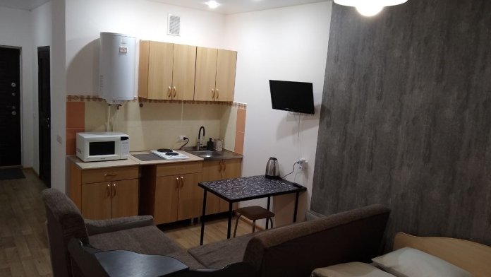 Полностью оборудованная кухня: микроволновка, чайник, электроплита, холодильник, посуда.