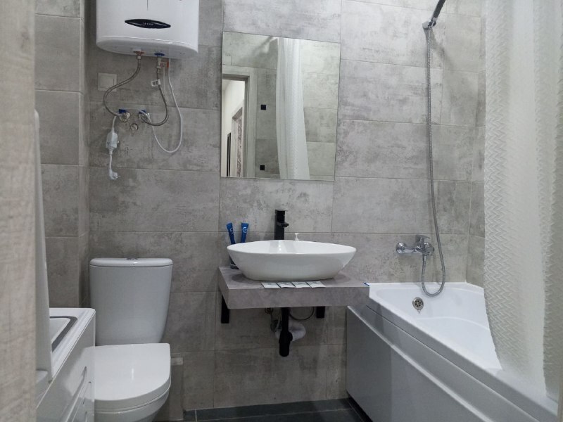 В санузле - средства гигиены (шампунь, гель для душа, зубная щётка и паста).