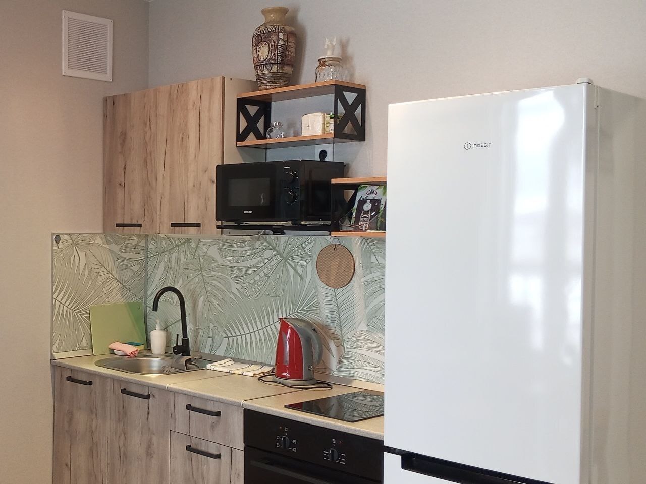 Полностью оборудованная кухня: микроволновка, чайник, электроплита, холодильник, посуда.