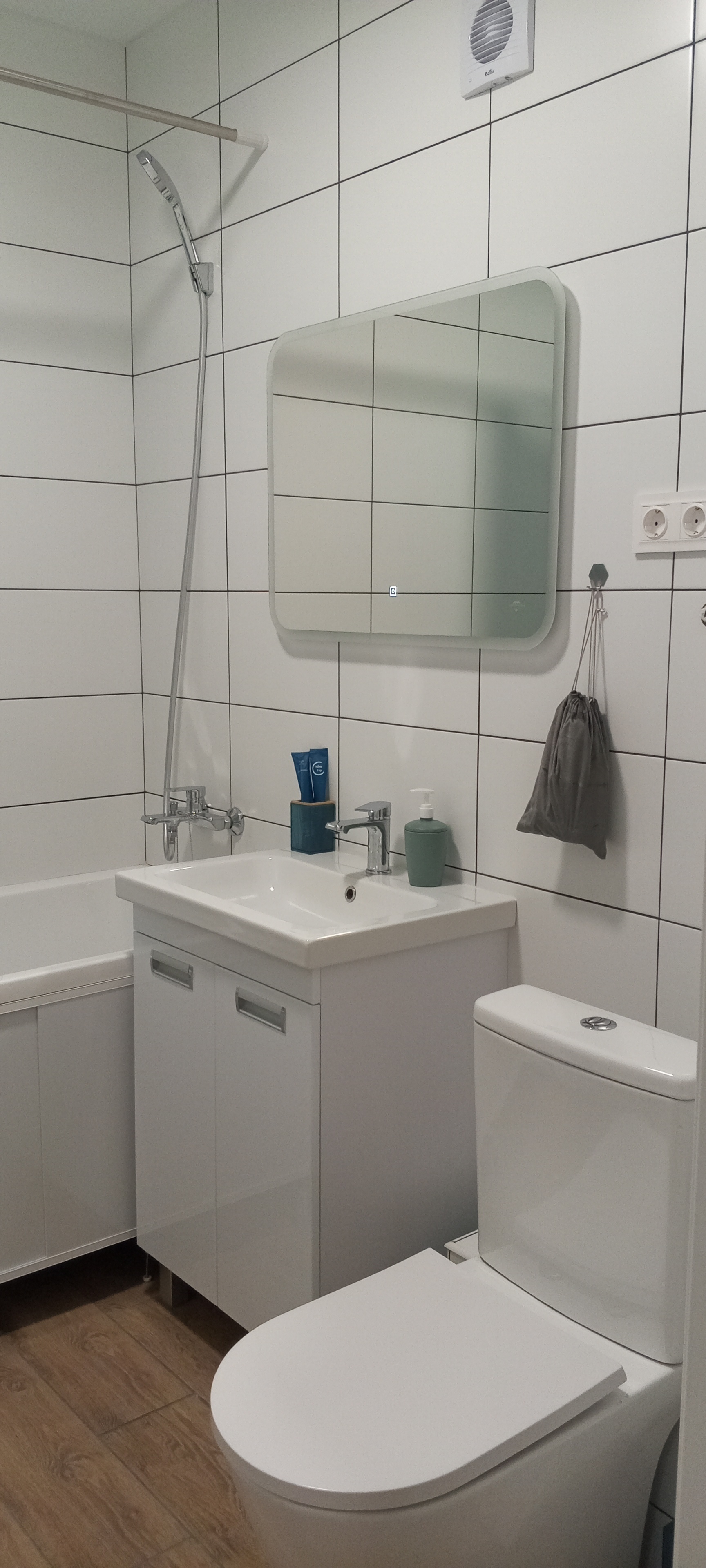В санузле - средства гигиены (шампунь, гель для душа, зубная щётка и паста).