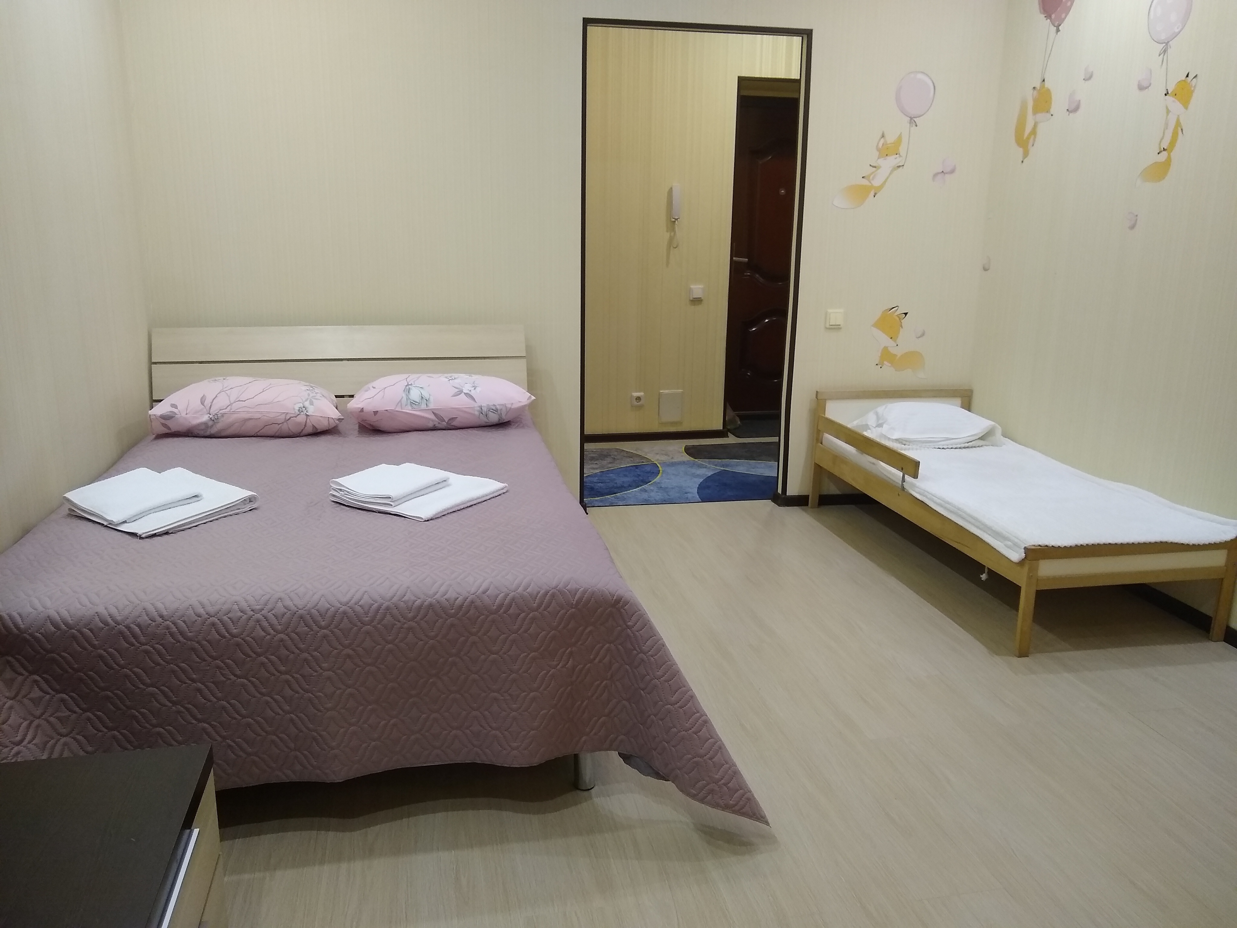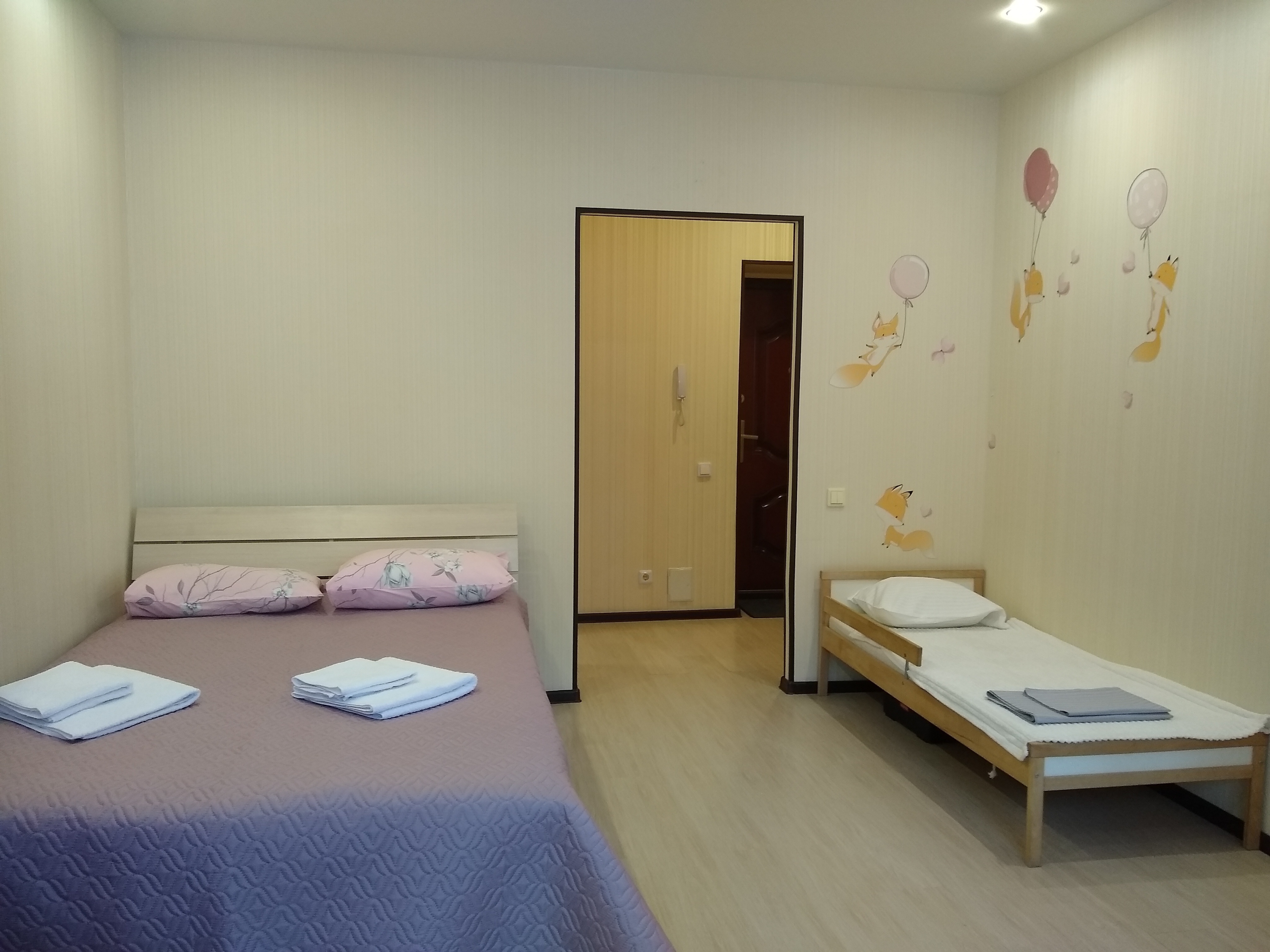 Спальные места: двуспальная кровать, раскладной диван, детская кроватка.
