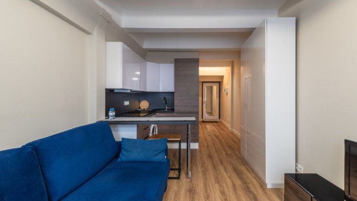 Интерьер выполнен в спокойных тонах с функциональной планировкой. В жилой зоне установлен удобный раскладной диван и телевизор. Кухонная часть оборудована варочной панелью, вытяжкой, холодильником и стиральной машиной, есть необходимая посуда и базовое оснащение для приготовления еды. Санузел совмещённый, с ванной и душевой системой.